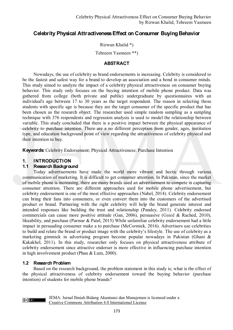 如今,越来越多的人使用名人作为品牌代言人。名人被认为是一个品牌在消费者心目中建立联系和纽带的最快、最安全的方式。这项研究旨在分析名人的外表吸引力对消费者购买行为的影响。本研究只关注手机产品的购买意愿。数据来自对大学(私人和公共)本科生的问卷调查,将年龄在17到30岁之间的学生作为调查目标。选择特定年龄的学生是因为他们是被选择作为研究对象的特定产品的目标消费者。研究人员采用简单随机抽样的方法对376名调查对象进行抽样,并采用回归分析的方法对变量之间的关系进行建模。本研究的结论是,名人的外表对购买意愿有正向的影响。无论是在性别、年龄、机构类型、教育背景等方面,他们对名人的外表吸引力和购买意愿的影响都没有不同看法。