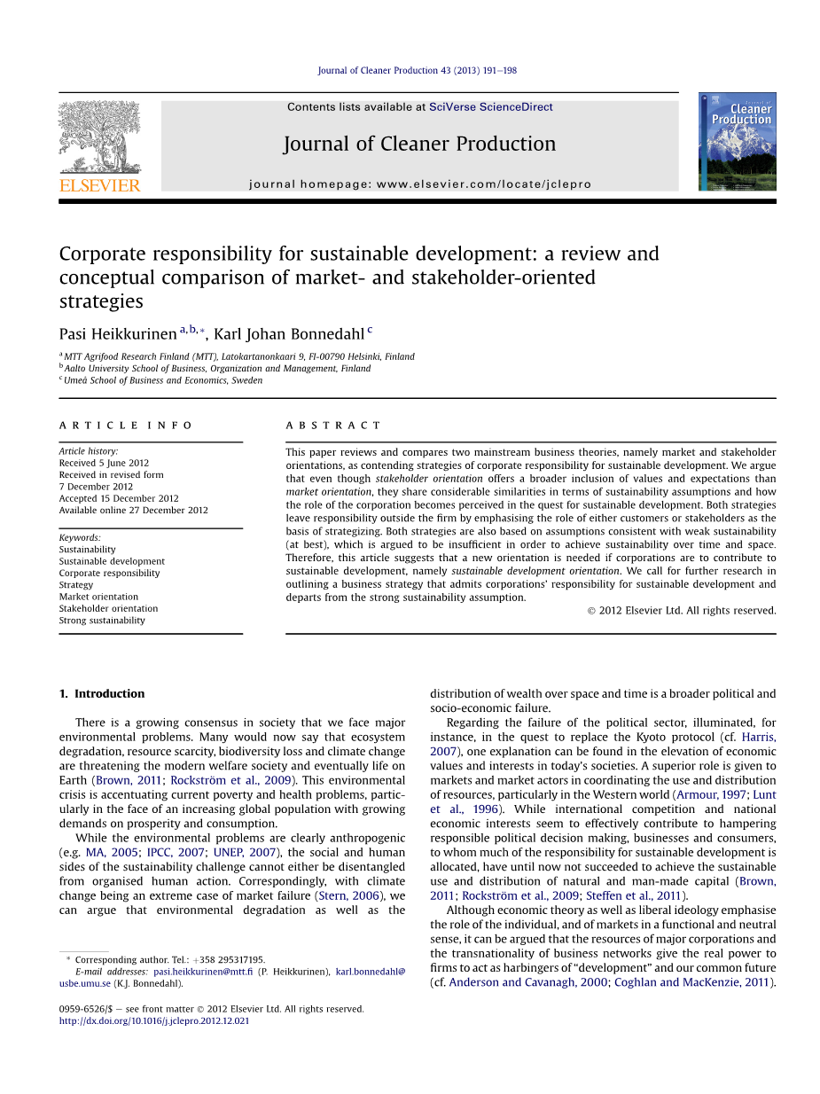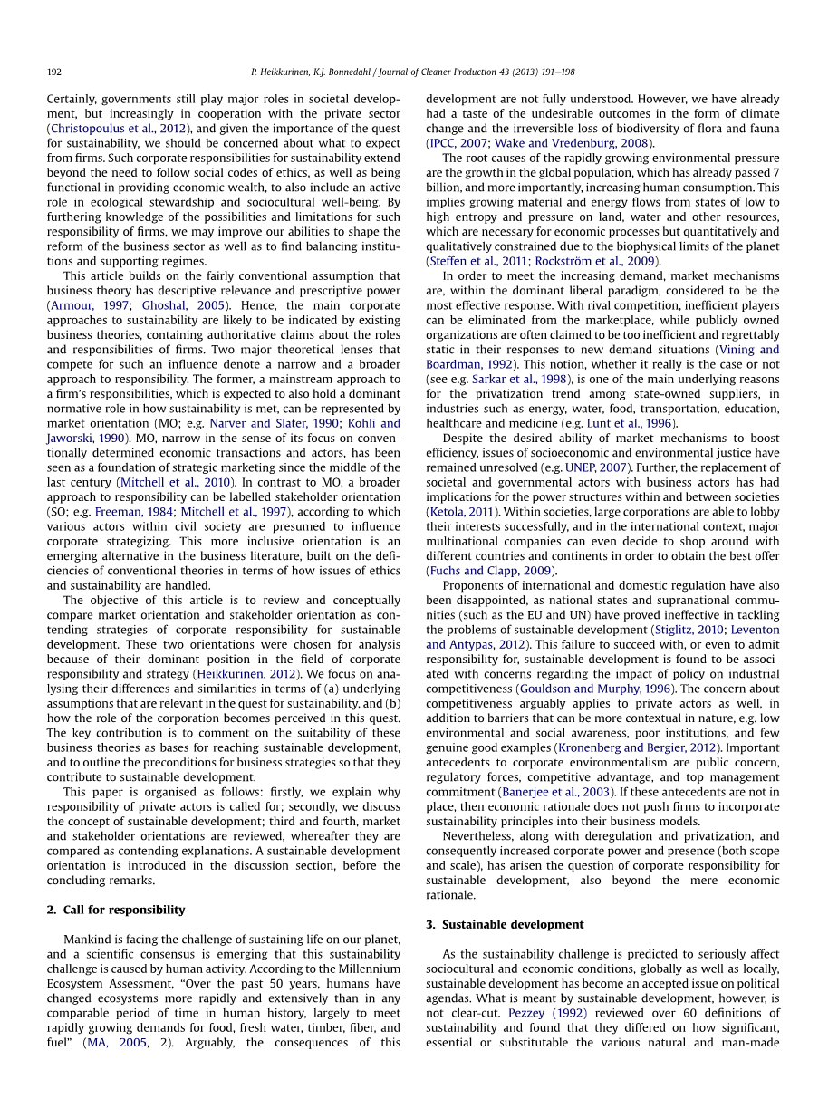 本文组织如下:首先,我们解释为什么私人参与者的责任要求;其次,我们讨论可持续发展的概念,第三和第四,市场和利益相关者方向进行了综述,然后他们比较竞争的解释。可持续发展方向介绍在讨论部分,结束语。