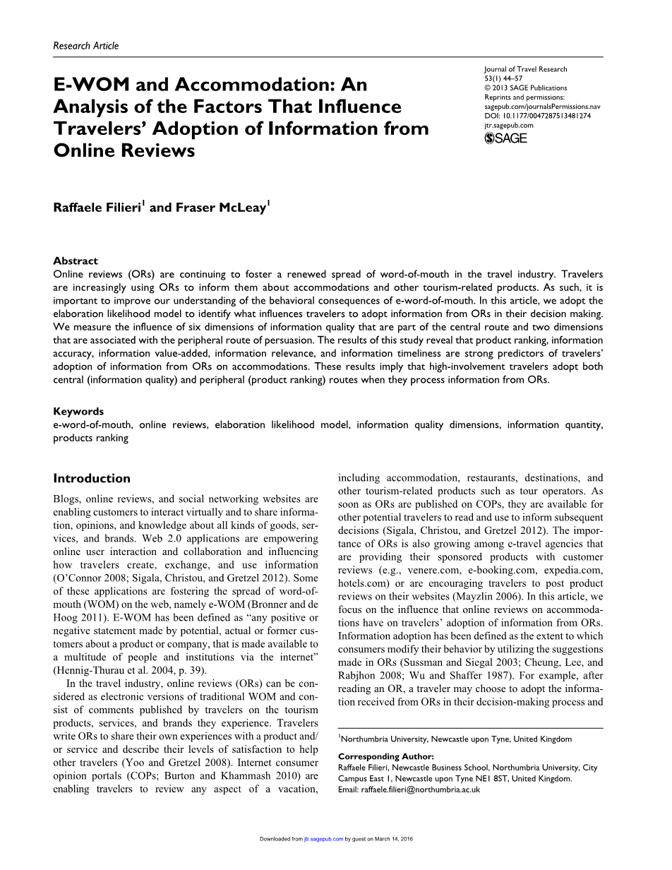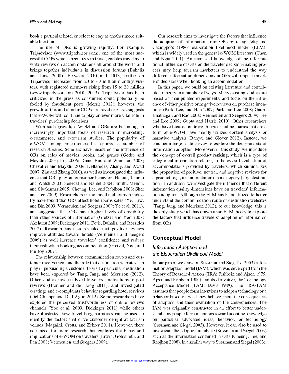 在旅游行业,在线评论(ORs)可以被认为是电子版本的传统口碑,包括旅游者对旅游产品、服务和品牌体验的评论。旅行者写在线评论分享自己的经验与产品、服务描述,他们的满意度,帮助其他旅行者(Yoo and Gretzel 2008)。网络消费者意见门户(COPs; Burton and Khammash 2010)使旅行者评论假期的任何一个方面成为可能,包括住宿、餐厅、目的地和其他旅行社等旅游相关的产品。在线评论法发表在网站上,它们可供其他潜在游客阅读、根据这些信息进行后续决策(Sigala,Christou,Gretzel 2012)。在线评论的重要性也在电子旅行机构提供赞助的产品(e.g.,venere.com, e-booking.com,expedia.com,hotels.com)中日益凸显,鼓励游客在其网站发布产品评论(Mayzlin 2006)。在本文中,我们专注于在线评论对旅行者住宿决策的影响,即他们如何采用在线评论的信息。采用信息被定义为消费者在多大程度上根据在线评论的内容改变他们的行为(Sussman and Siegal 2003; Cheung, Lee, and Rabjhon 2008; Wu and Shaffer 1987).。例如,在阅读在线评论后,一个旅行者可能会选择根据在线评论信息做出决策,预定一个特定的酒店或选择呆在另一个更合适的位置。