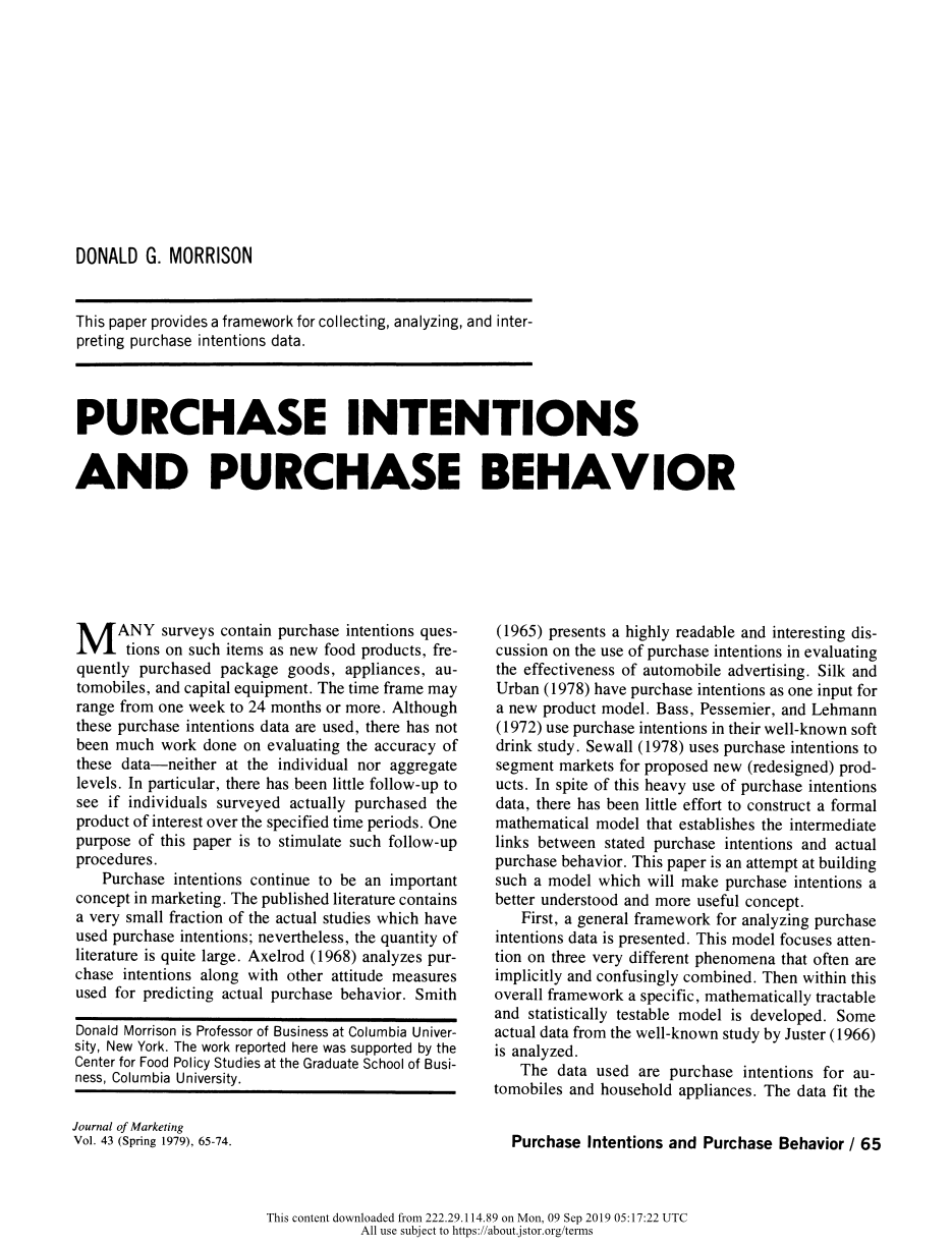首先,提出了用于分析购买意愿数据的通用框架。该模型将注意力集中在三个非常不同的现象上,这些现象常常被隐式和混乱地结合在一起。然后,在此总体框架内,开发了一个特定的,在数学上易于处理且在统计上可测试的模型。分析了 Juster(1966)的一项著名研究的一些实际数据。使用的数据是汽车和家用电器的购买意向。数据适合购买意向和购买行为,该模型很好,但这不是重点。相反,该模型突出显示了主要购买汽车的意图数据与仍53%的人表示肯定会购买新车。我们如何评估该统计数据?就其本身而言,并不能说太多。但是,在我们模型的背景下,53%的统计数据看起来相当“不错”。现在,我们将继续开发允许我们进行评估的模型。