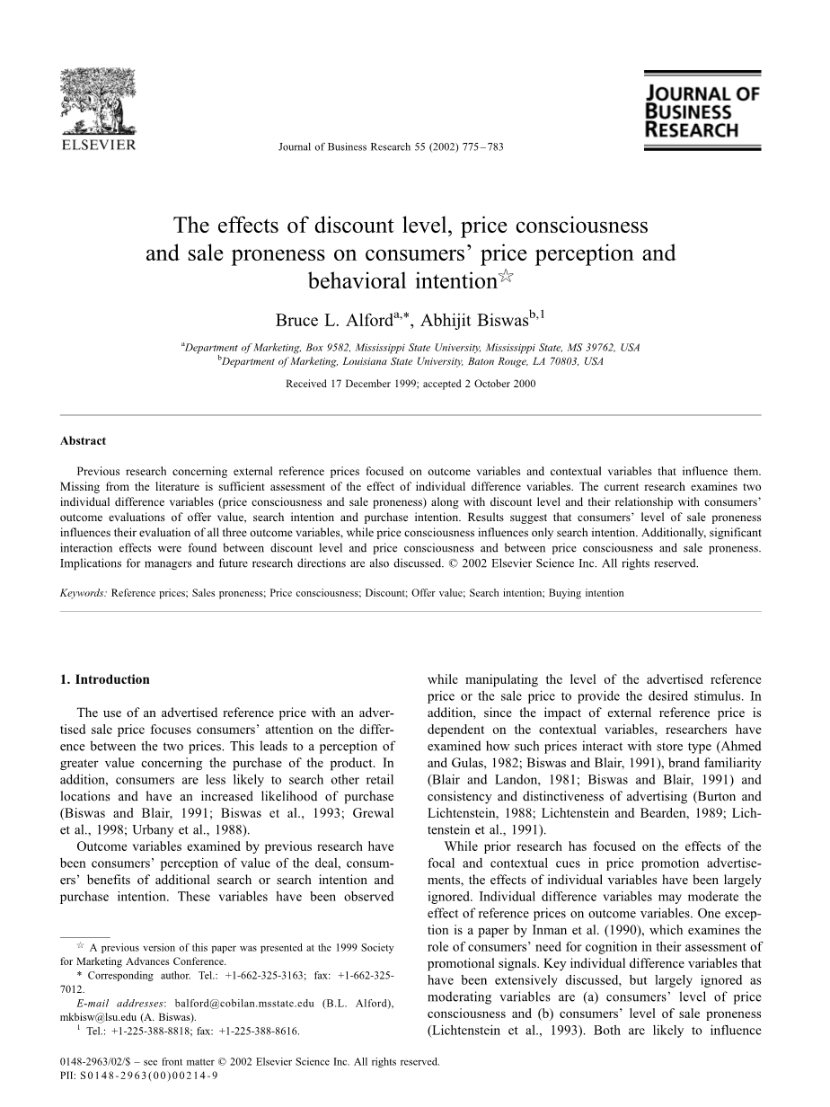 折扣水平和销售倾向对消费者价格认知的影响外文翻译资料