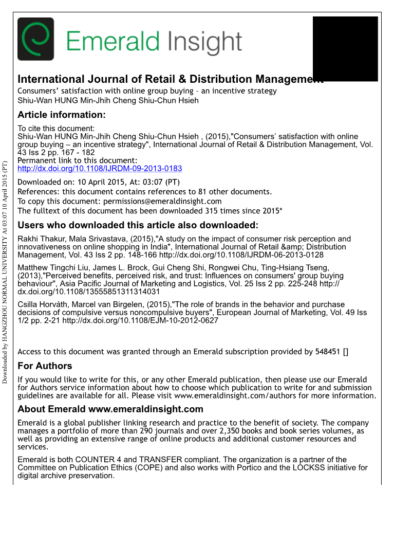 团购以显著降低的价格提供产品和服务,条件是最低数量的买家将购买。它允许消费者从零售商获得折扣价格当一大群人愿意购买相同的物品。最近团购的网站已经 成为一个主要的在线购物业务。由于企业对消费者电子商务的重要性,许多企业建立了在线商店提供相关信息和服务公司和/或产品((Fang et al., 2011; de Faultrier and Towers, 2011; Lee et al., 2011)。随着消费者根据他们的需求进行电子商务交易,网络团购已经成为最受欢迎的购买模型(Jing and Xie, 2011; Gehrt et al., 2012; Xu-Priour and Cliquet, 2013)。没有时间和空间限制,在线团购允许消费者购买的数量价格与其他消费者相同或相似的需求,从而增加他们的价格谈判能力。另一方面,企业降低交易频率通过团购进一步降低交易成本。