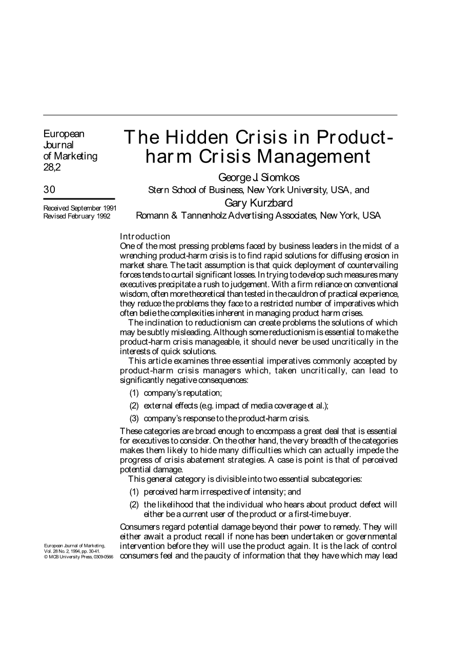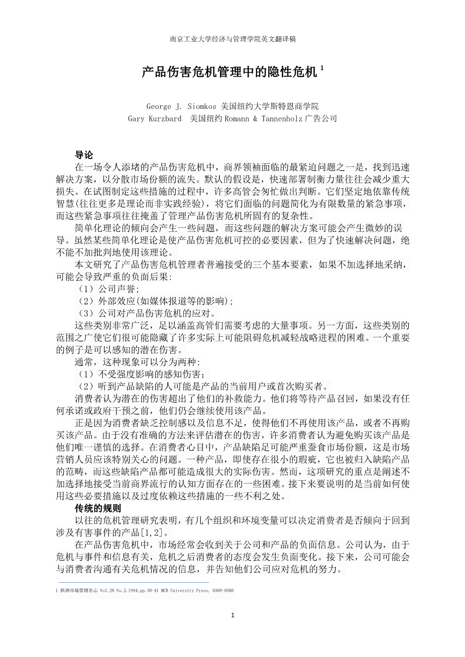 产品伤害危机管理中的隐性危机'外文翻译资料