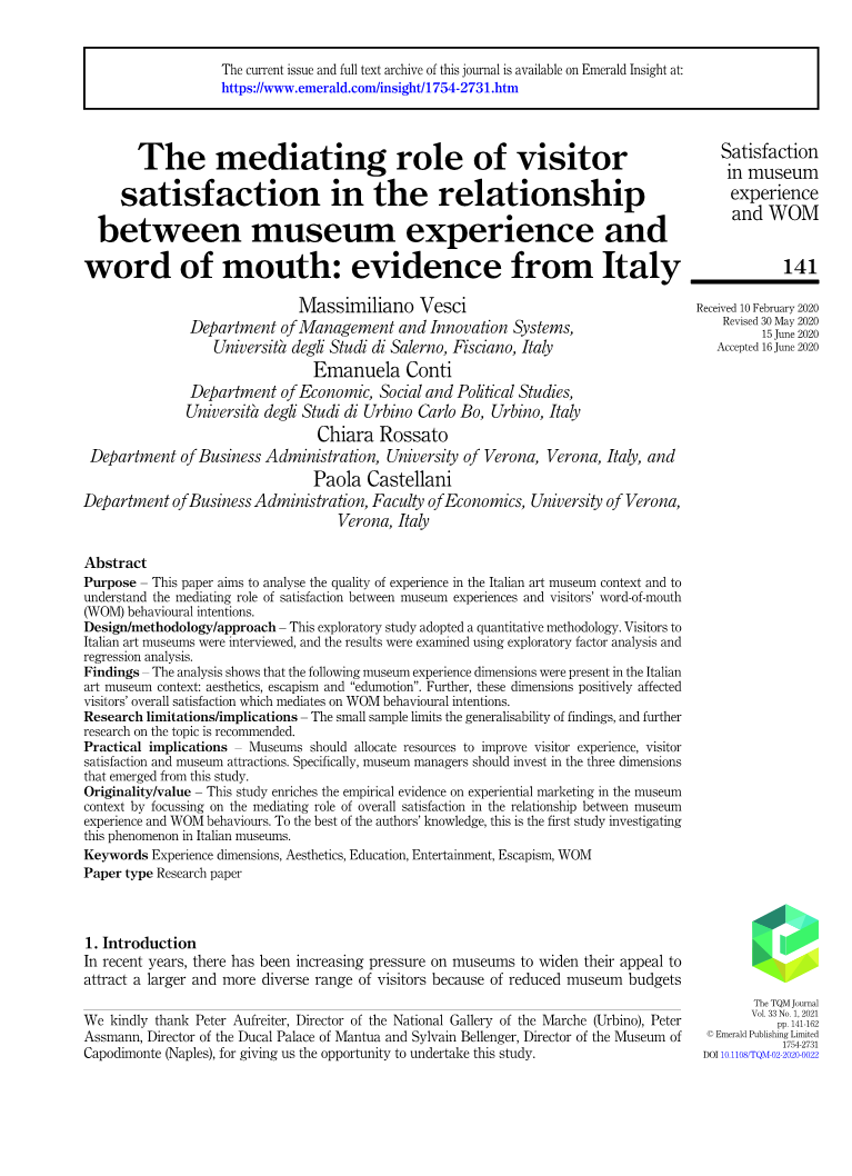 为填补第二个空白,本研究开发了一个框架,探讨满意度在博物馆体验与游客口碑之间的中介作用。特别是,我们开发了一个框架,其中博物馆体验与整体满意度相关,因为我们相信,体验是满意度的主要驱动因素,它是建立在博物馆背景和游客特征的基础上的,反过来,满意度与口碑的行为意向有关,在博物馆的背景下,这被认为是最合适的忠诚度测量方法。为了追求这些目标,该研究在三个国家进行了调查意大利美术馆,代表了重要的非营利文化组织,必须从市场营销的角度进行管理,特别注意游客体验管理,并实施了序贯回归分析。