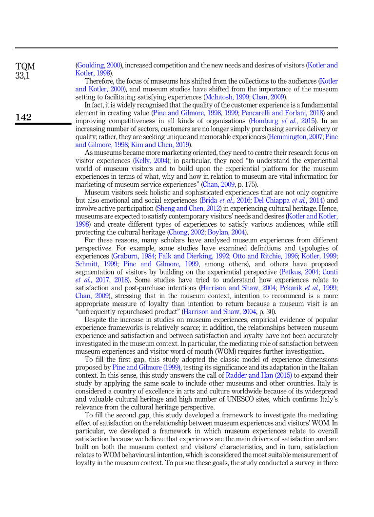基于这些原因,许多学者从不同的角度对博物馆体验进行了分析。例如,一些研究审查了经验的定义和类型学等人提出了基于体验视角对访问者进行细分。一些研究试图理解体验与满意度和购买后意愿之间的关系,强调在博物馆背景下,推荐意愿比返回意愿更适合衡量忠诚度,因为参观博物馆是一种“不常被再次购买的产品”。