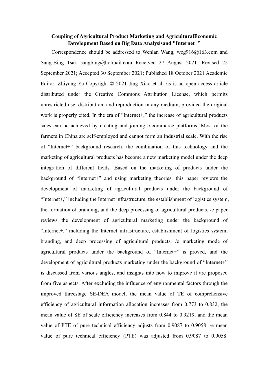 基于大数据分析和“互联网”的农产品营销与农业经济发展耦合外文翻译资料