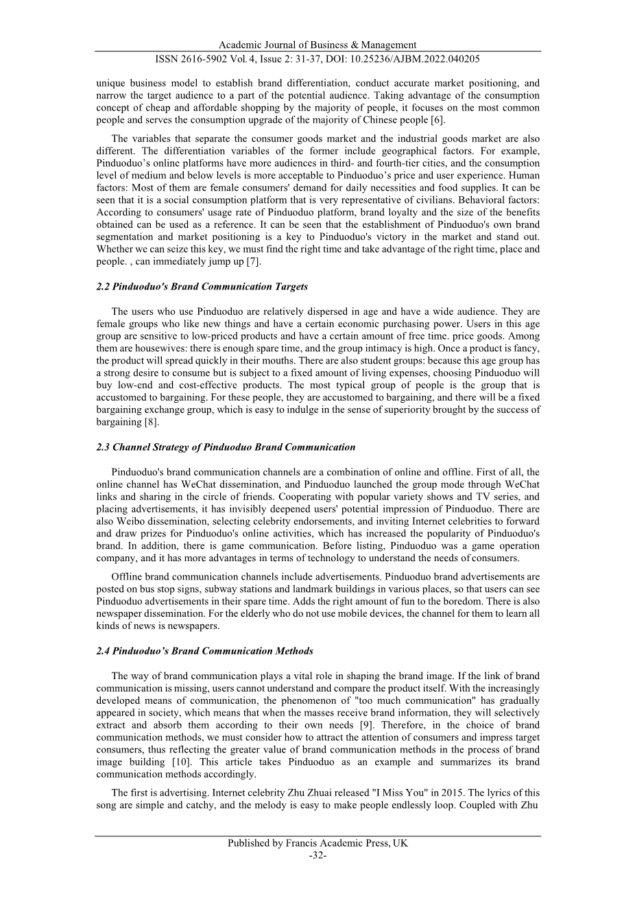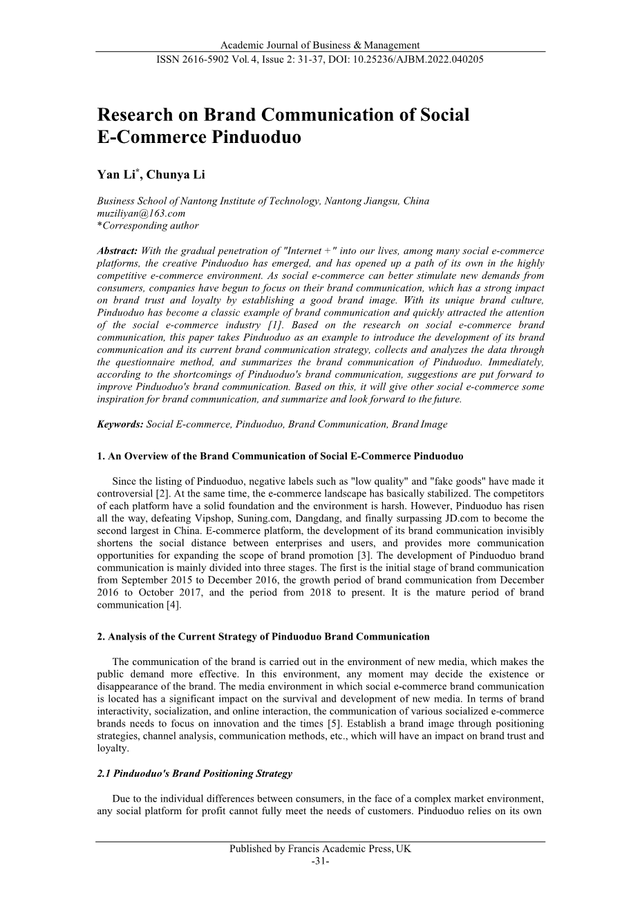 摘要:随着“互联网 ”逐渐渗透到我们的生活中,在众多社交电商平台中,创意拼多多应运而生,并在竞争激烈的电商环境中走出了一条属于自己的道路。由于社交电商能更好地激发消费者的新需求,企业开始关注品牌传播,通过树立良好的品牌形象,对品牌信任度和忠诚度产生强烈影响。凭借独特的品牌文化,拼多多成为品牌传播的经典范例,并迅速引起社交电商行业的关注[1]。本文在对社交电商品牌传播研究的基础上,以拼多多为例,介绍其品牌传播的发展历程和目前的品牌传播策略,通过问卷调查的方式收集和分析数据,总结出拼多多的品牌传播情况。拼多多。随即,针对拼多多品牌传播存在的不足,提出改进拼多多品牌传播的建议。以此为基础,给其他社交电商品牌传播一些启示,总结展望未来。