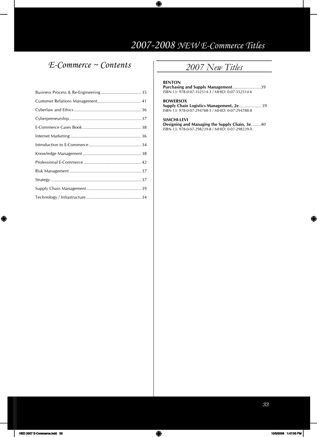 1.电子商务概论 2.电子商务:商业模式 3. 电子数据交换 4. 电子商务:架构框架5. 电子商务:网络基础设施 6. 电子商务:信息分发与信息传递 7. 电子商务:信息发布技术 8. 电子商务:在网络上确保业务 9. 电子商务:确保网络交易 10. 电子支付系统 11. 电子商务:搜索引擎和目录服务 12. 互联网广告 13. 移动商务:介绍、框架与模型 14. 电子商务中的代理