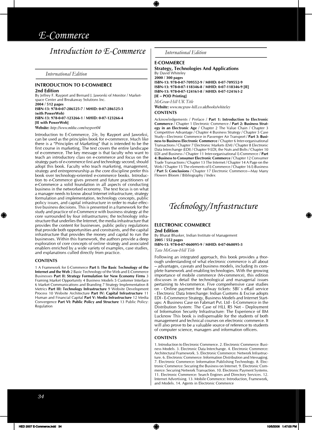 对电子商务的介绍的第二版本,作者是Rayport 和 Jaworksi,这个版本可以作为电子商务的原则性书籍。在此之中,有一个市场营销原理,这将有望成为市场营销的第一课程。此篇文章覆盖了整个电子商务的框架。非常关键的是那些想教授电子商务介绍课程的并且聚焦与于电子商务策略部分,其次是科技的教职工应该采用这本书。教授以市场营销、管理、策略学以及企业家能力为核心规律的教职工喜欢这本书更胜于以科技为中心为导向的书。介绍电子商务给当前和未来的电子商务从业者在网络经济中开展业务的各个方面奠定了坚实的基础。文本的重点是一个经理所需要了解有关互联网基础设施的东西,战略制定和实施,技术概念,公共政策问题,资本基础设施,以作出有效的业务决策。这是一种电子商务实践的研究框架,这种框架是以在核心周围环绕着基础设施业务战略为中心的;技术基础结构,是网络媒体的基础设施,为企业提供内容,公共政策法规提供机会和限制,以及资本基础设施运行的业务提供货币与资本。在这个框架内,作者通过各种各样的例子提供了一个深入探讨的在线战略的核心概念和相关因素,案例丰富,说明直接从实践中得来。