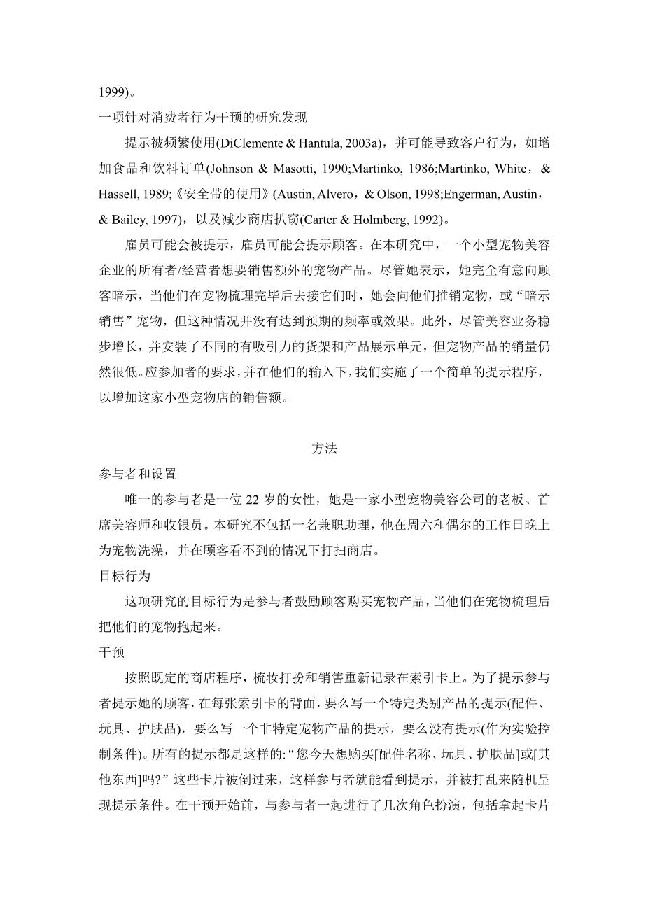 ABSTRACT. A simple prompting procedure involving index cards was used to increase suggestive selling by the owner/operator of a small pet grooming business. Over a year of baseline data revealed that no sales prompts were given and few pet products were sold. When the owner was prompted by an index card to ask customers if they wanted to pur- chase pet products, sales tripled and increased four-fold by the end of the year. This study is part of an increasing interest in the behavioral analy- sis of consumer choice and addresses both management and marketing concerns by demonstrating how a simple, well-replicated prompting procedure can modify a key employee behavior that in turn changes customer behavior, and results in an important organizational outcome. [Article copies available for a fee from The Haworth Document Delivery Service: