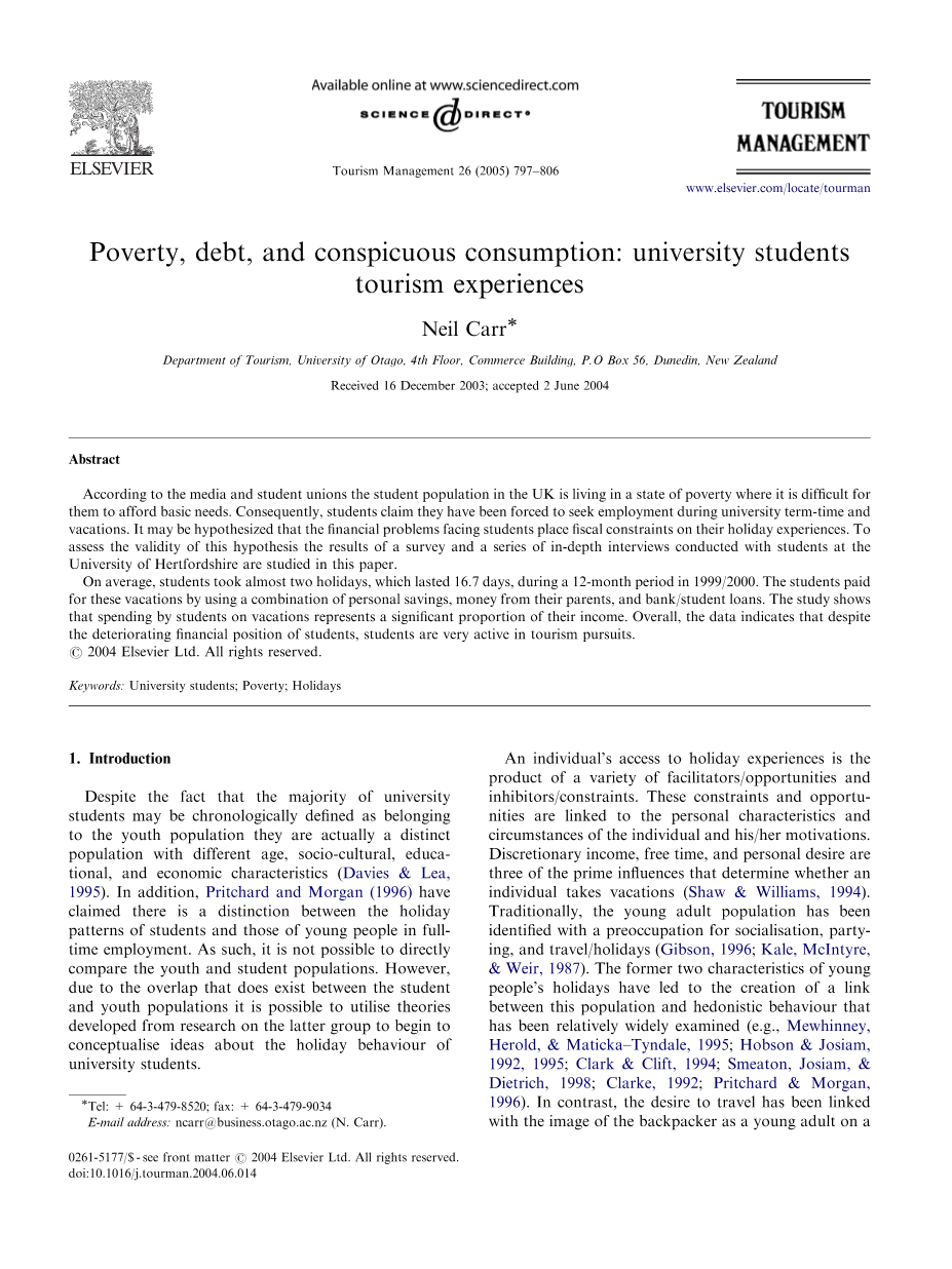 贫困、债务和炫耀性消费:大学生的旅游体验外文翻译资料