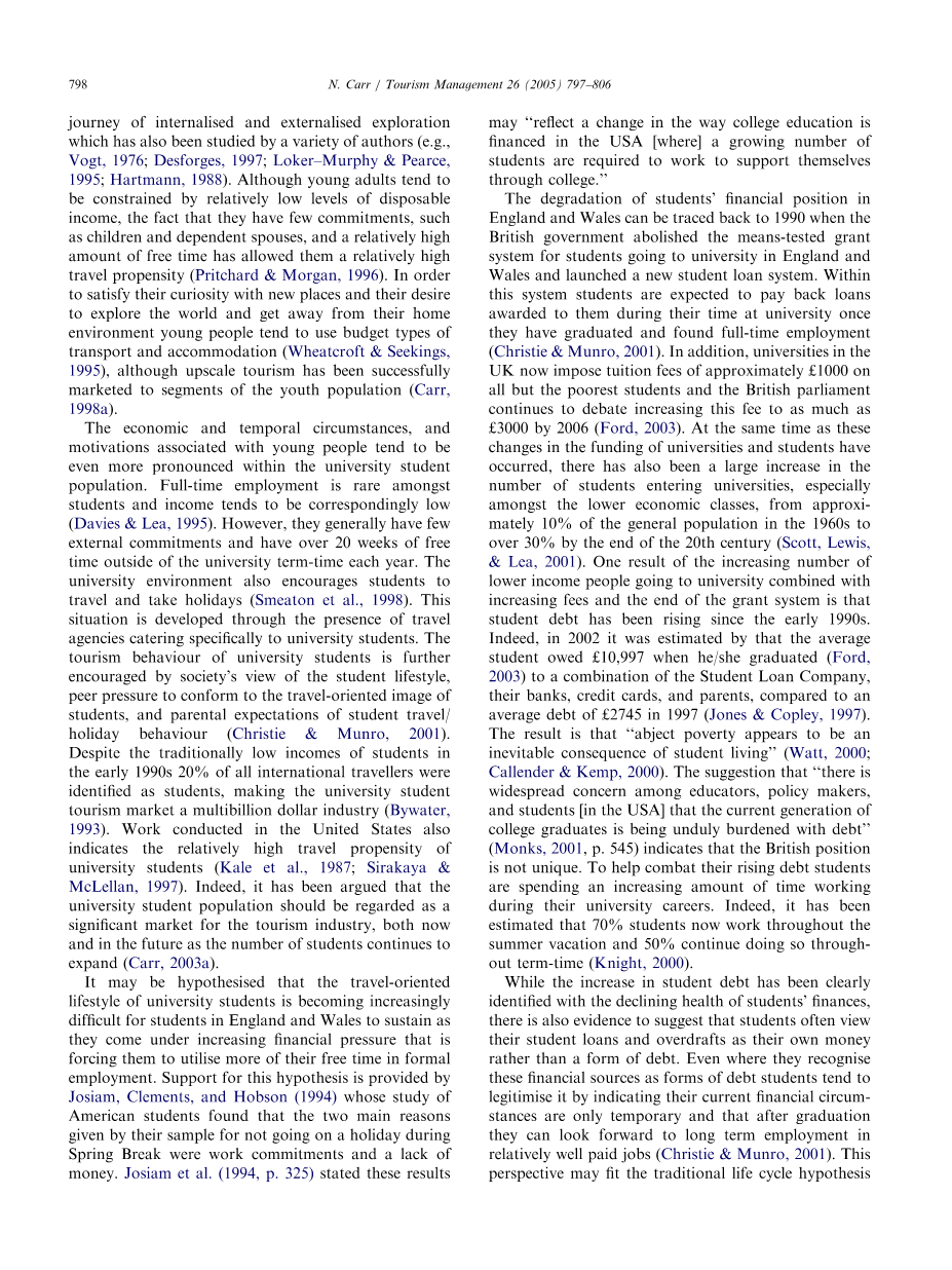 可以假设,随着英格兰和威尔士学生面临越来越大的经济压力,他们越来越难以维持以旅行为导向的生活方式,这迫使他们在正式就业中利用更多的自由时间。Josiam、Clements和Hobson(1994)支持这一假设,他们对美国学生的研究发现,春假期间不去度假的两个主要原因是工作承诺和缺钱。Josiam等人(1994年,第325页)指出,这些结果可能“反映了美国大学教育筹资方式的变化[在美国,越来越多的学生需要工作来维持自己的大学生活]。