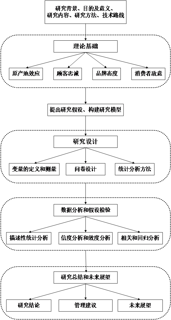 本文第一章主要对研究背景进行了阐述,明确了本研究的目的和意义,确定了研究内容、研究方法和技术路线;第二章通过对文献的梳理形成理论基础;第三章提出研究假设并据此设计概念模型;第四章开展研究设计,完成变量的测量并在此基础上设计问卷;第五章对问卷回收的数据进行分析并验证假设;最后一章得出研究结论并在结论的基础上对中国服装品牌如何运用原产地效应来进一步发展和规避风险提出营销方面的建议,同时总结研究的局限性并提出对未来研究的展望。