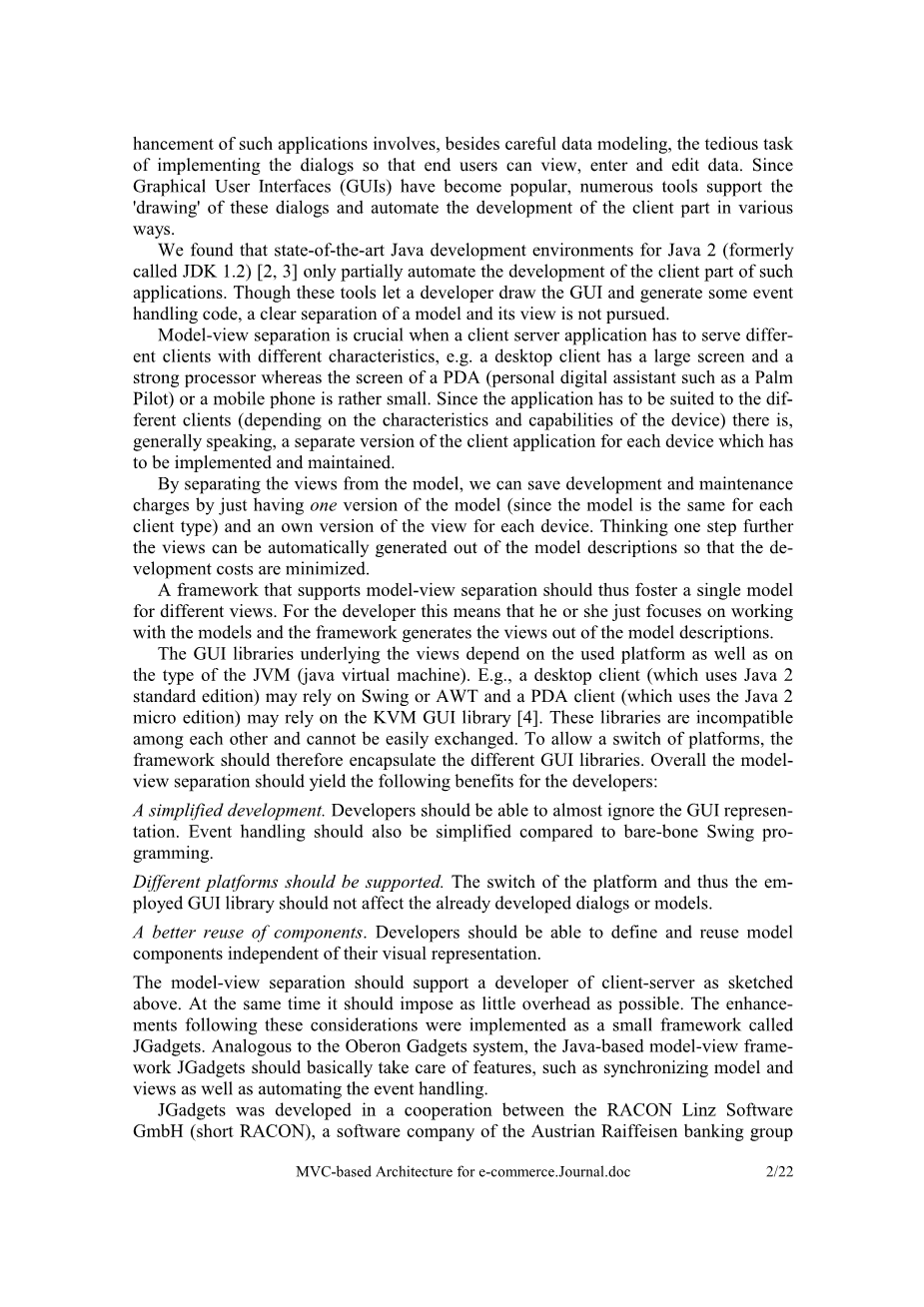 模型-视图分离应该支持上面概述的客户机-服务器开发人员。与此同时,它应该尽可能地减少开销。基于这些考虑的增强是作为一个名为jgadget的小框架实现的。与Oberon gadget系统类似,基于java的模型-视图框架JGadgets基本上应该处理一些特性,比如同步模型和视图,以及自动化事件处理。