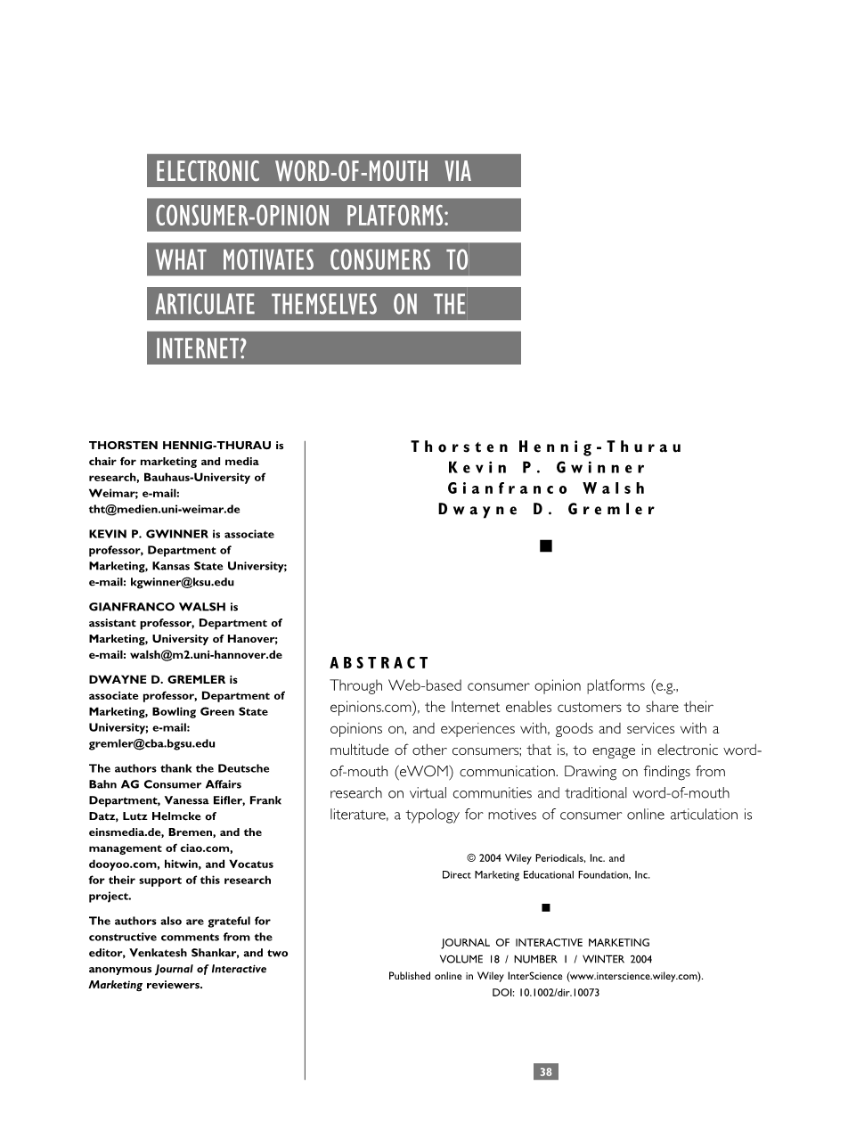 通过基于网页的消费者意见的平台(如epinions.com),互联网使顾客分享他们的意见和经验,还有与众多的其他消费者相关的商品和服务;也正是我们所称的,从事电子口碑营销通信。利用虚拟社区发现和研究传统口碑文学,设置一个类型学为动机的消费者为在线发音。使用在线样本约2000消费者,信息的结构和相关性的动机消费者的在线生成连接。结果分析表明:消费者的对社会交往的渴望,渴望经济激励,他们关心其他消费者,和可能提高自己的自我价值的主要因素导致电子口碑营销行为。同时进一步指出,电子口碑营销提供者可以根据他们的行为的动机是什么分组,这表明公司可能需要开发不同的策略来鼓励电子口碑营销行为在他们的用户。