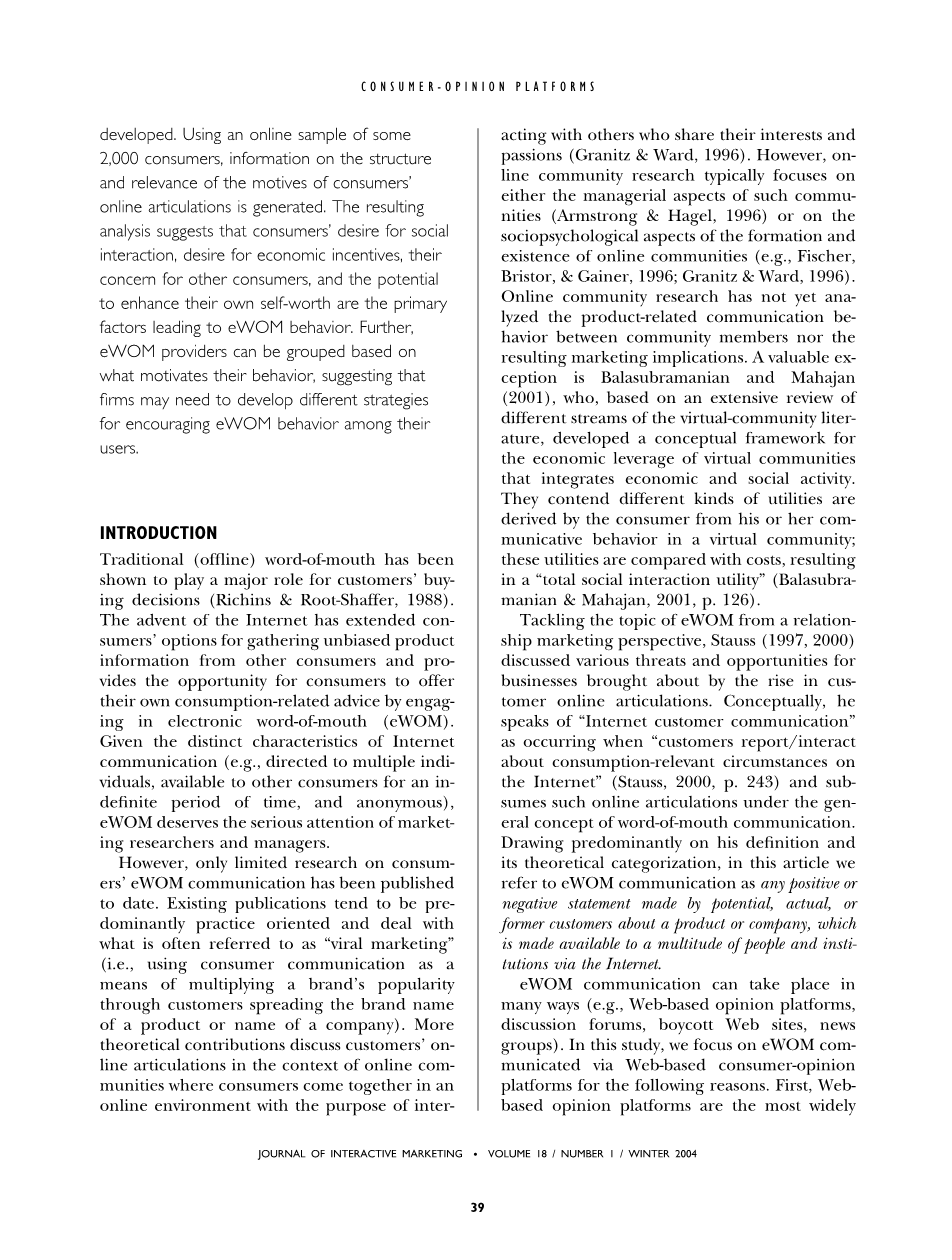 这篇文章的目的是为了更好地理解消费者的决定背后的动机参与电子口碑营销沟通网络消费者意见的平台。我们首先回顾文献对客户的动机从事口碑(蠕虫)通信。使用Balasubramanian效用提出的类型学和Mahajan(2001)在虚拟社区中作为一个框架,用于我们的讨论,我们确定了11个客户的在线连接的潜在动机。这些动机的重要性电子口碑营销沟通然后通过因素得分进行回归分析超过2000消费者的使用示例。最后,我们讨论对营销理论和管理的影响。