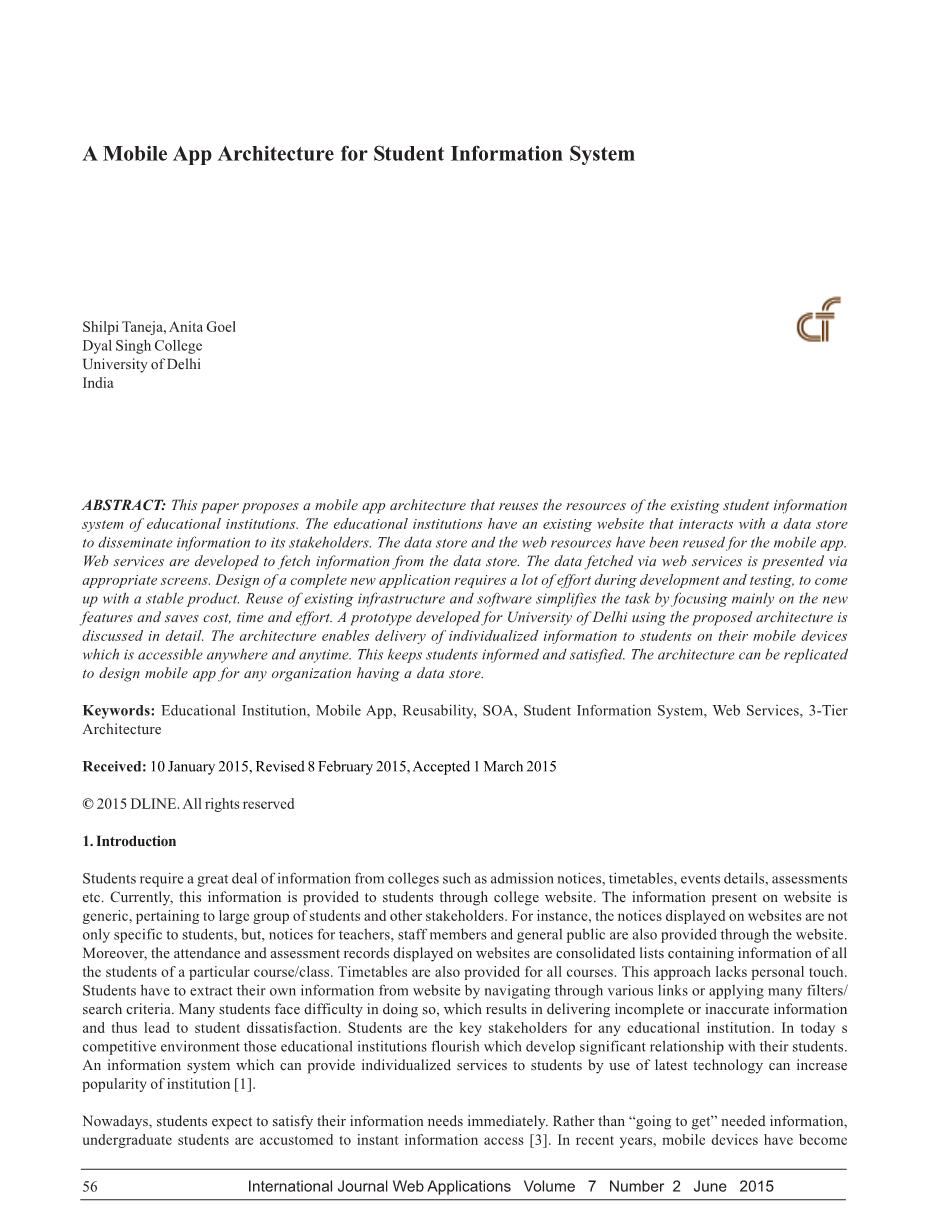 摘要:本文提出了利用现有学生信息的资源,移动应用架构教育机构的体系。教育机构有一个现有的,与数据存储交互把信息传播给它的利益相关者的网站。数据存储和网络资源已经被重新用于移动应用程序。开发web服务以获取从数据存储的信息。通过web服务取出的数据经由相应的屏幕呈现。需要开发和测试过程中很多的努力一个完整的新应用程序的设计,来了一个稳定的产品。现有的基础设施和软件的再使用主要集中在新的功能和节省成本,时间和精力。详细地讨论了一个为德里大学开发的使用所提出的体系结构的原型。该结构也能让学生随时随地访问在他们的移动设备交付的个性化的信息。这样可以让学生了解和满足。该架构可被复制为任何组织设计移动应用程序具有的数据存储。