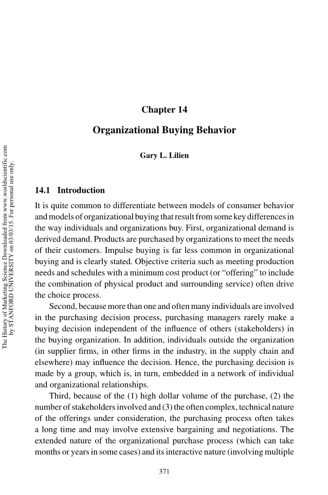 20世纪70年代发表了十几篇关于组织购买的论文(详见 Reid and Plank, 2000)。Webster(1984)觉得有三个模型是适用广泛的,因为在此过程中确定了重要的变量之间的关系:Sheth(1973)模型中,Webster-Wind模型(1972年)和Choffray-Lilien模型(1980)。
