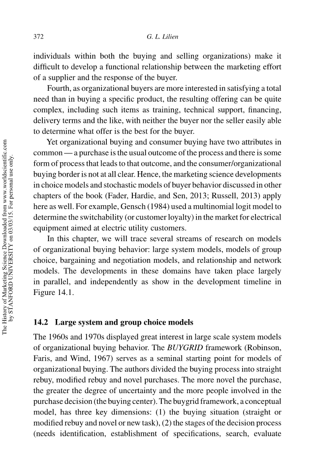 在这一章,我们将跟踪几个研究组织购买行为的研究模型:大系统模型,模型组的选择,谈判和协商模型,关系和网络模型。这些领域的发展发生了很大程度上并行,开发时间表如图14.1所示。