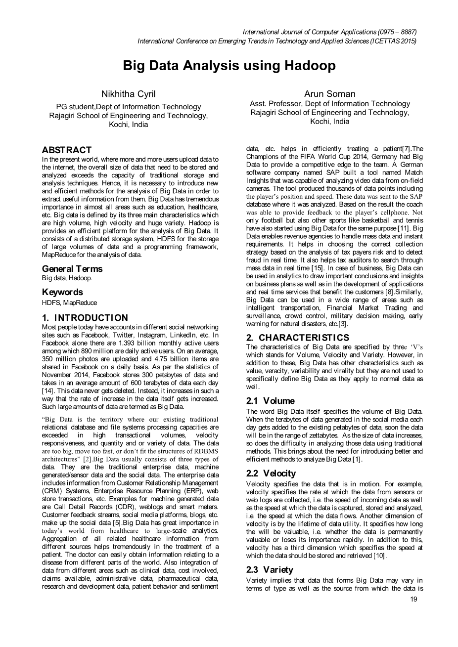 综上,已经证明了大数据在教育、体育、医疗等不同领域进行大规模数据分析的重要性。如果进行正确地存储和分析,大数据几乎可以在这些领域发挥大的成效。大数据的分析包括在不同阶段进行数据采集、数据记录、信息提取、数据清理、数据集成、数据聚合、数据查询、数据建模和数据分析。基于HFDS和MapReduce的Apache Hadoop提供了一个有效的框架来分析大数据。在未来,我们可以编写出不同的MapReduce程序来进行大数据分析,我们也能编辑Hadoop源代码来提高Hadoop性能。