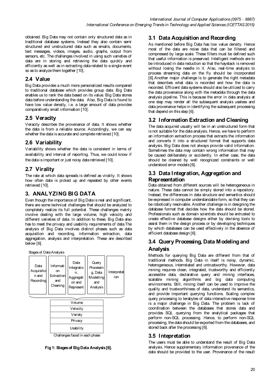 尽管大数据的重要性在于真实和有意义,但有些技术挑战应该被分析来实现其全部潜力。这些挑战主要涉及处理大容量、高速度、不同种类的数据。除了这些,大数据必须满足数据的隐私性和可用性需求。大数据的分析涉及数据不同的阶段,如采集和记录、信息提取、数据聚合、分析和解释,下面就是相应描述[6]。