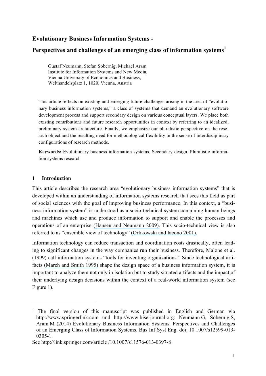 本文描述了研究领域“进化的业务信息系统”,对其内部开发的理解研究,认为这一领域的一部分社会科学的目的是提高企业绩效。在这种背景下,一个“商业信息系统”是理解为一个包含人类社会技术系统和机器的使用和生产支持和启用流程和信息运营企业(Hansen and Neumann 2009)。这也是社会技术视图被称为“合奏的视图技术”(Orlikowski和Iacono 2001)。