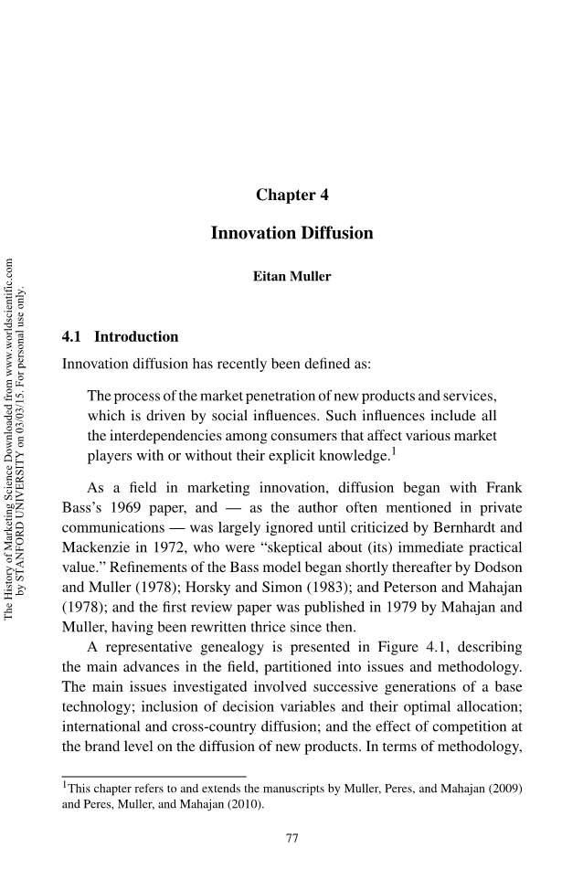 作为营销创新的一个领域,扩散开始出现在Frank Bass 1969年发表的论文中,Frank Bass作为笔者经常在私人通讯中被提及,但是还是很大程度地被忽视直到1972年被Bernhardt and Mackenzie做出“怀疑(它的)直接实用价值“的批评。Bass模型的改进始于此后不久的odson 和 Muller (1978); Horsky 和 Simon (1983); 还有 Peterson 和 Mahajan(1978); 和1979年出版的由Mahajan 和 Muller写的第一个文献综述,自那时起经历了三次改写。