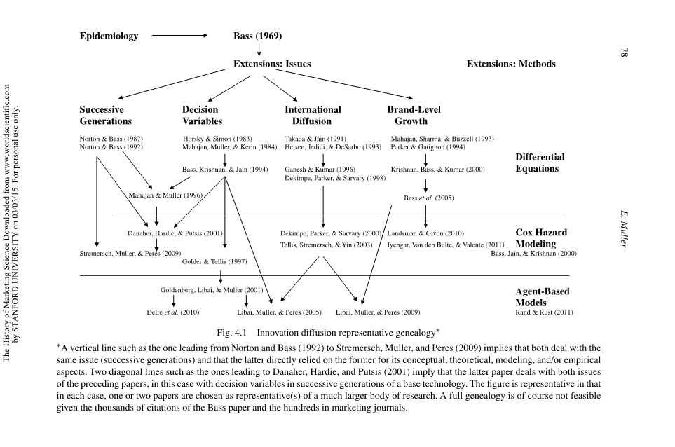 *A vertical line such as the one leading from Norton and Bass (1992) to Stremersch, Muller, and Peres (2009) implies that both deal with the same issue (successive generations) and that the latter directly relied on the former for its conceptual, theoretical, modeling, and/or empirical aspects. Two diagonal lines such as the ones leading to Danaher, Hardie, and Putsis (2001) imply that the latter paper deals with both issues of the preceding papers, in this case with decision variables in successive generations of a base technology. The figure is representative in that in each case, one or two papers are chosen as representative(s) of a much larger body of research. A full genealogy is of course not feasible given the thousands of citations of the Bass paper and the hundreds in marketing journals.