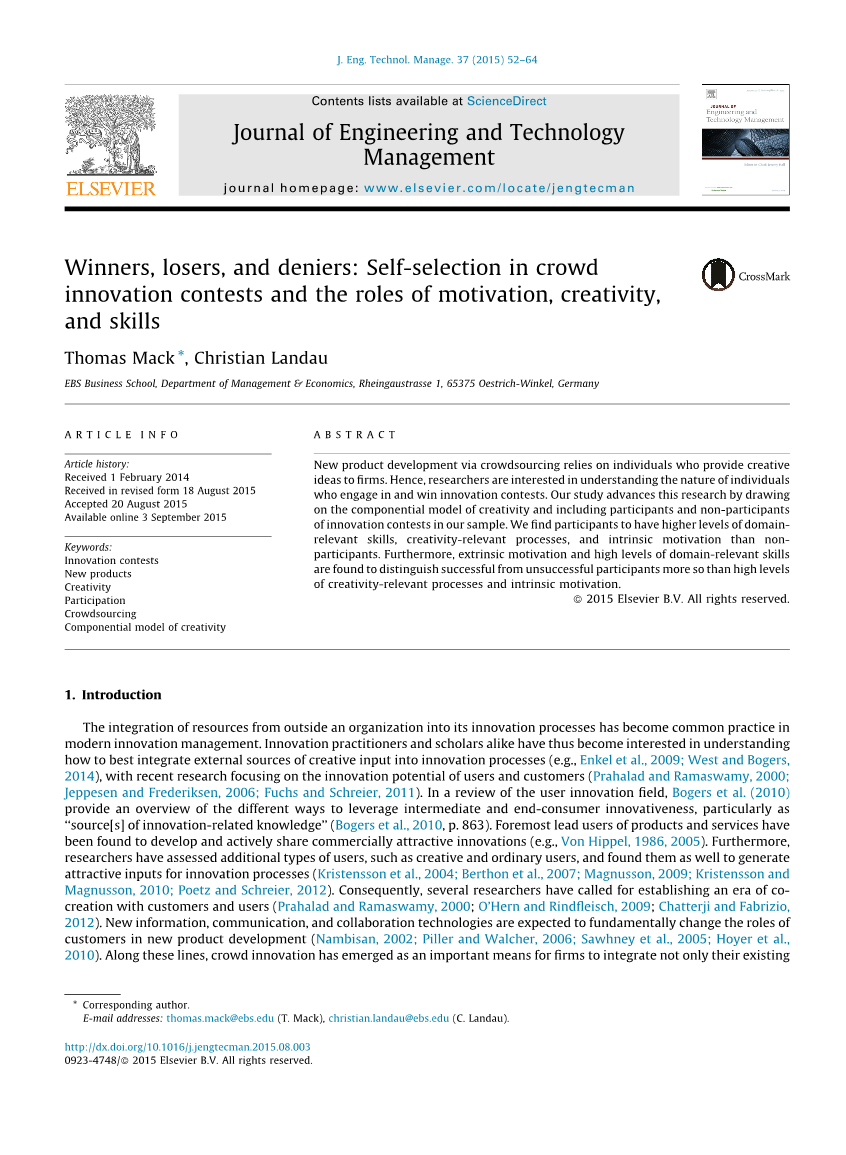 成功者,失败者和非参与者:人群创新竞赛中的自我选择以及动机、创造力和技能的作用外文翻译资料