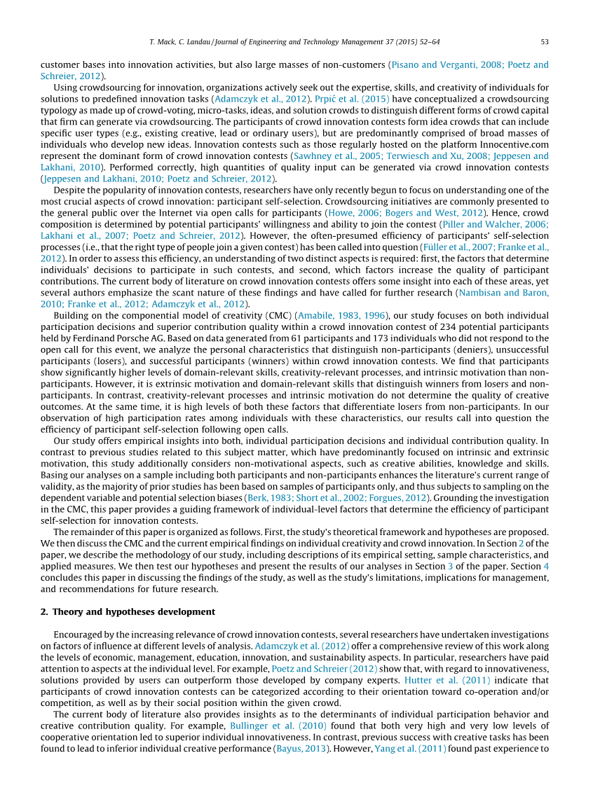 尽管创新竞赛很受欢迎,但研究人员最近才开始专注于理解人群创新最关键的方面之一:参与者自我选择。众包行动通常通过互联网向公众发布(Howe,2006;Bogers和West,2012)。因此,人群构成取决于潜在参与者参加比赛的意愿和能力(Piller和Walcher,2006; Lakhani等,2007;Poetz和Schreier,2012)。然而,参与者的自我选择过程(即正确类型的人加入某一特定比赛)的经常假定的效率已经受到质疑(Fulerler等,2007;Franke等, 2012)。 为了评估这种效率,需要对两个不同方面的理解:第一,决定参与这种竞赛的个人决定的因素;第二,哪些因素会提高参与者的贡献质量。目前关于人群创新竞赛的文献提供了对这些领域的一些见解,然而一些作者强调了这些研究的不足之处,并呼吁进一步研究 (Nambisan and Baron, 2010;Franke等,2012;Adamczyk等,2012)。