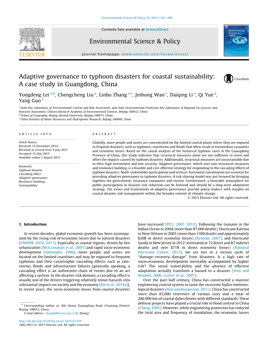 台风的次生灾害,如溃坝,往往是造成大量人员伤亡和经济损失的主要原因之一。从历史上看,中国的灾害管理战略对于台风和洪水都集中在工程控制(Han和Kasperson,2011)。这一传统在一定程度上允许甚至加速了灾害易发地区的农业、工业和商业发展的密集占领,增加了人口的灾害风险。特别是在沿海地区,灾害往往成为灾害由于缺乏社会应变能力和适应能力(Wisner等人., 2004 和 Berkhout等人,2006)。在过去的几十年里,即使在中国工程控制工程的不断建设,这些项目的失败往往造成许多人员伤亡和财产损失,已构成对沿海社会安全的一大威胁。