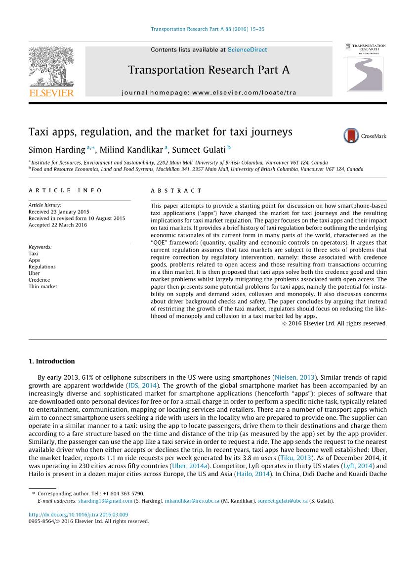 公共交通的文献中很少关注这些问题。有研究认为通过智能手机技术的潜力,可以更改公共交通系统的管理(米高梅,2014年)。也有大量的技术研究认为智能手机技术应用可以授权现有的出租车行业(陈,2014年);(卢远和严,2012)还有一些意见指向,出租车的应用程序和未经授权的供应商进入出租车市场的准入标准相关争论的焦点(见沃尔顿,2014年)。还有智能手机技术在出租车市场(DAUS,2012)的法律问题涉及法律研究。但是,基于目前的研究,还没有在这个不断发展的技术出租车出行在市场上的影响及其调控影响方面的影响的工作原理。