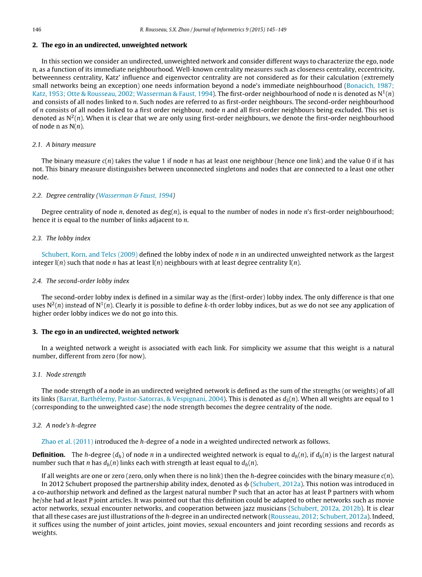 数字,使得n具有至少等于d h(n)的强度的d h(n)链接。如果所有权重为1或0(零,仅当没有链接时),则h度与二进制度量c(n)重合。在2012年舒伯特提出合伙能力指数,表示为? (Schubert,2012a)。这个概念被介绍了一个共同作者网络,被定义为最大的自然数P,使得一个演员至少有P个伙伴与他们他/她至少有P篇联合文章。有人指出,这个定义可以适应电影等其他网络演员网络,性相遇网络以及爵士音乐家之间的合作(Schubert,2012a,2012b)。很明显所有这些情况只是一个无向网络中的高等学位图示(Rousseau,2012; Schubert,2012a)。确实,使用联合文章,联合电影,性遭遇和联合记录会议记录的数量就足够了权重。