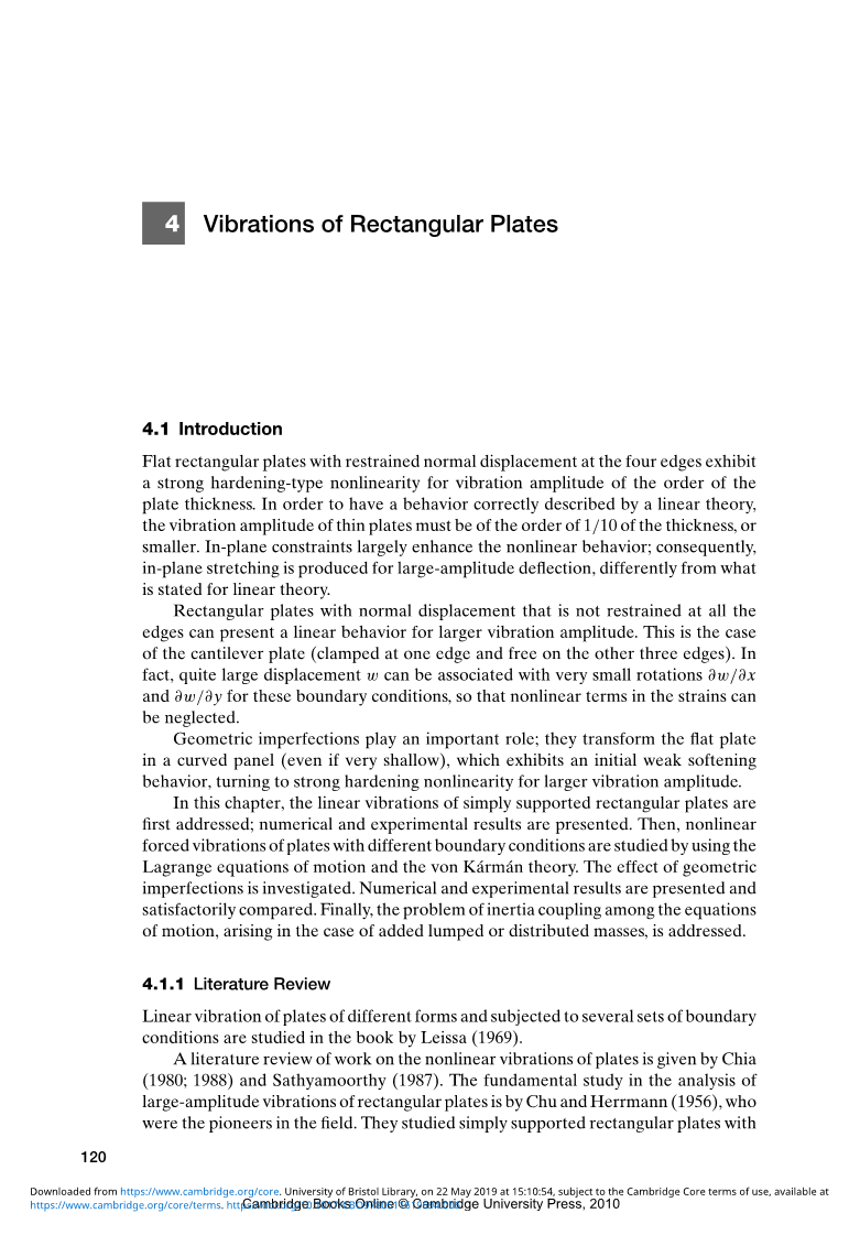 Chia(1980; 1988)和Sathyamoorthy(1987)对板的非线性振动进行了文献综述。矩形板大振幅振动分析的基础研究是Chu和Herrmann(1956),他们是该领域的先驱。他们研究了具有固定边缘的简单支撑矩形板,并获得了基本模态的主干曲线。通过使用扰动过程获得溶液,并显示出强硬化类型的非线性。