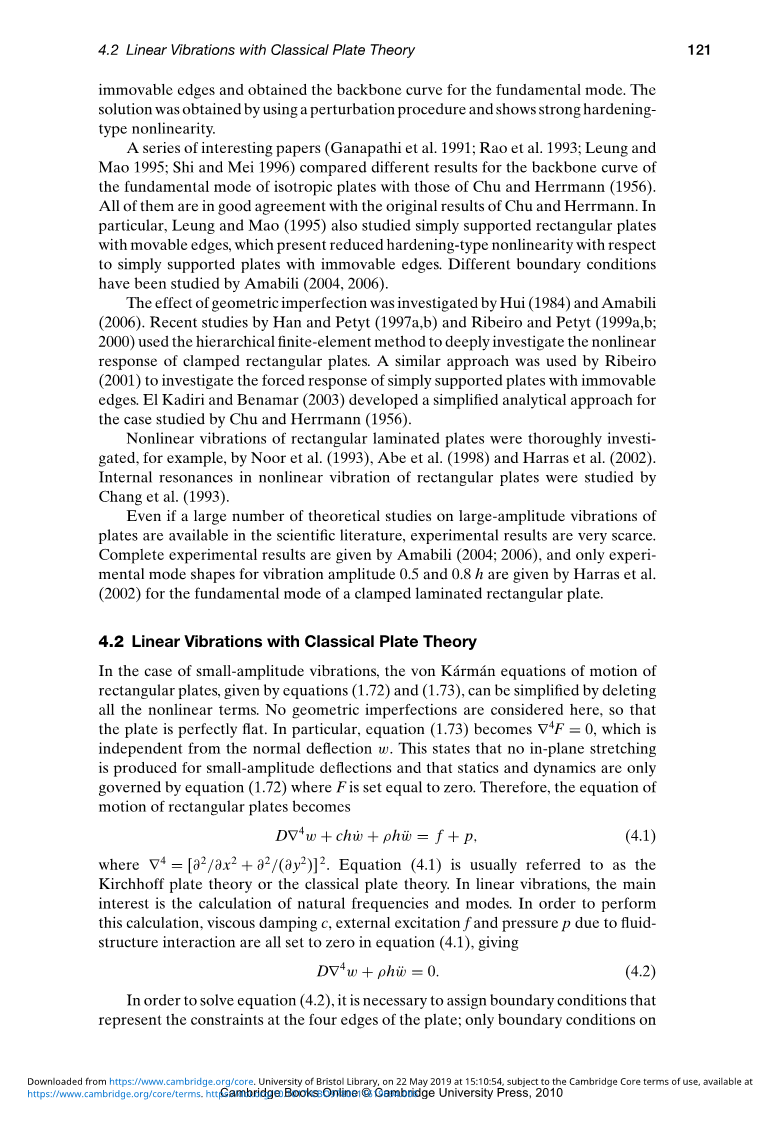 Hui(1984)和Amabili(2006)研究了几何缺陷的影响。Han和Petyt(1997a,b)以及Ribeiro和Petyt(1999a,b; 2000)的最新研究使用分层有限元方法深入研究了固定矩形板的非线性响应。Ribeiro(2001)使用了类似的方法来研究具有固定边缘的简单支撑板的强迫响应。El Kadiri和Benamar(2003)为Chu和Herrmann(1956)研究的案例开发了一种简化的分析方法。