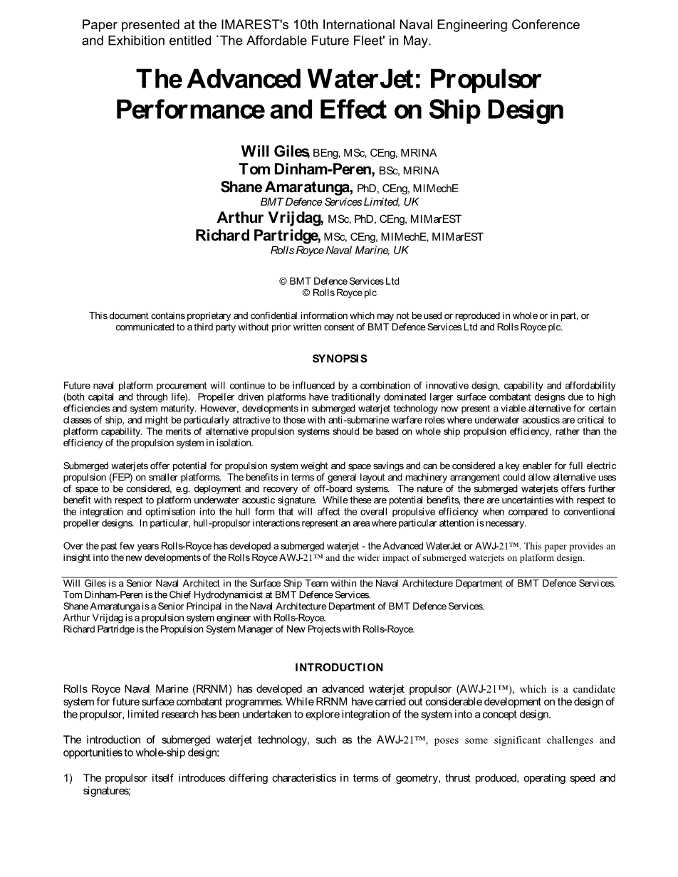 在过去的几年里,Rolls-Royce公司已经开发了一种浸没式喷水推进器——先进的喷水推进器(AWJ-21trade;)。本文介绍了Rolls-Royce公司AWJ-21trade;的最新发展,以及浸没式喷水推进对平台设计的广泛影响。