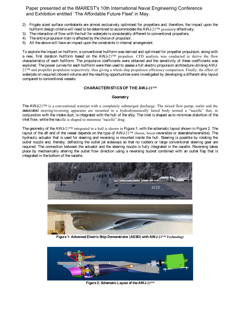 Rolls Royce公司军船部(RRNM)已经开发了一种先进的喷水推进器(AWJ-21trade;),这是未来水面作战计划的候选系统。虽然RRNM在推进器的设计上已经有了相当大的发展,但是在探索将系统集成到船舶概念设计上的研究还很有限。