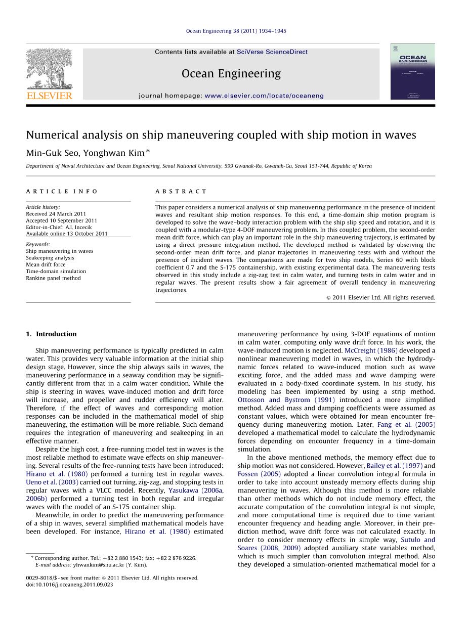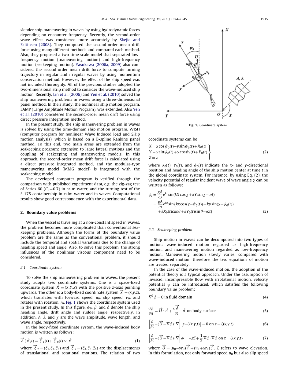 在上述方法中未考虑由于船舶运动引起的记忆效应。 但是,Bailey等。 (1997年)和福森(2005年)采用了线性卷积积分公式,以考虑到船舶在波浪操纵过程中的非稳态记忆效应。 虽然这种方法比不包括记忆效应的其他方法更可靠,卷积积分的精确计算并不简单,而且,由于多变的遭遇频率和航向角,需要更多的计算时间。而且,在他们的预测方法中,没有精确地计算出波浪漂移力。 为了简单地考虑记忆效应,Sutulo和Soares(2008,2009)采用了辅助状态变量法,该方法比卷积积分法简单得多。他们还根据遇到的频率,利用流体动力对波浪中的细长船舶开发了面向仿真的数学模型. 最近,Skejic和Faltinsen (2008)更加准确地考虑了二阶波动效应。他们使用许多不同的方法计算了二阶平均漂移力,并比较了每种方法。另外,他们提出了一个两倍尺度的模型,该模型将低频运动(操纵运动)和高频运动(耐波运动)分开。Yasukawa (2006a, 2009)还考虑了使用动量守恒方法计算二阶平均漂移力来计算规则波和不规则波的转弯轨迹。但是,船速的影响并未完全包括在内。以前的所有研究都采用二维带状方法来考虑波浪引起的船舶运动。最近, Lin等(2006)和Yen等。 2010年)使用三维直板方法解决波浪中的船舶操纵问题。在他们的研究中,扩展了非线性船舶运动程序LAMP (大振幅运动程序)。yen等(2010)也考虑使用直接压力积分法的二阶平均漂移力。