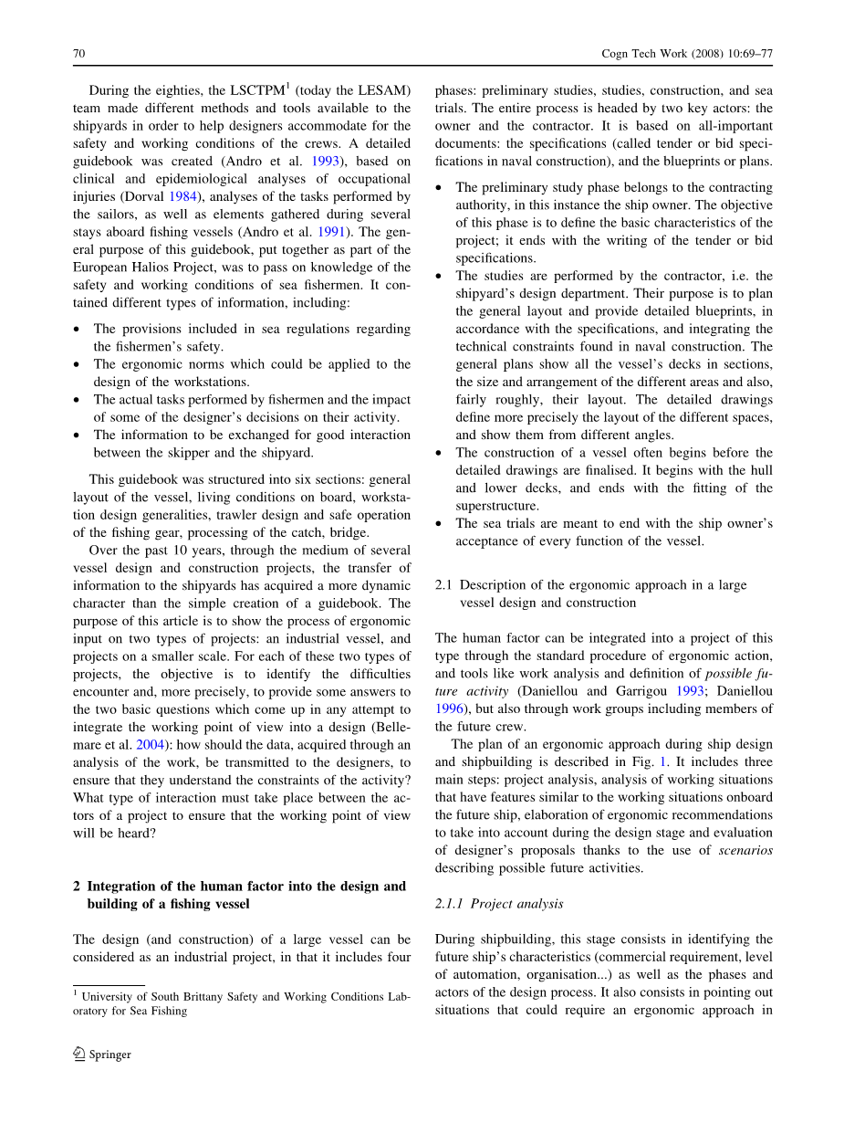 在80年代,LSCTPM(法国南部一所大学海上捕捞安全与工况研究机构,现称LESAM)研究机构针对船厂创建了不同的模型和工具,帮助设计师设计出适应船员的安全与工作环境的方案。以临床和流行病学的职业伤害研究为基础,一个详细的指南书(Dorval. 1984)诞生了。作为欧洲Halios项目的组成部分,该指南的总体目标是:讲解渔船船员安全与工作环境方面的知识。它涵盖了不同类别的信息,即: