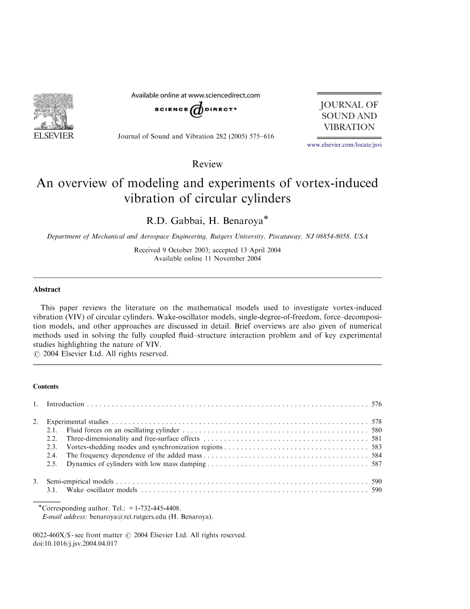 在本篇综述中,对圆柱体涡激振动的基本模型和理论研究都进行了详细的叙述。作者的目标是对内容进行彻底的叙述,但仍有不全面的地方。可用于预测受到流体力作用下的圆柱体响应的半经验模型,是本篇论述的重点。这些模型是不严谨的,而且一般情况下最保守的见解。 为了理解流体对结构的影响,实际流场的描述则显得十分重要。因此,本篇综述的第二个重点是讨论圆柱体周围流体的特性。由绕流分离产生的流动场是一个非常复杂的流体动力学问题。然而,关于钝体绕流的研究目前已经取得了很大的进展,尤其是在计算流体力学领域方面,而且钝体绕流与本篇综述的重点相关,本综述摘录了重点研究相关内容的论文。