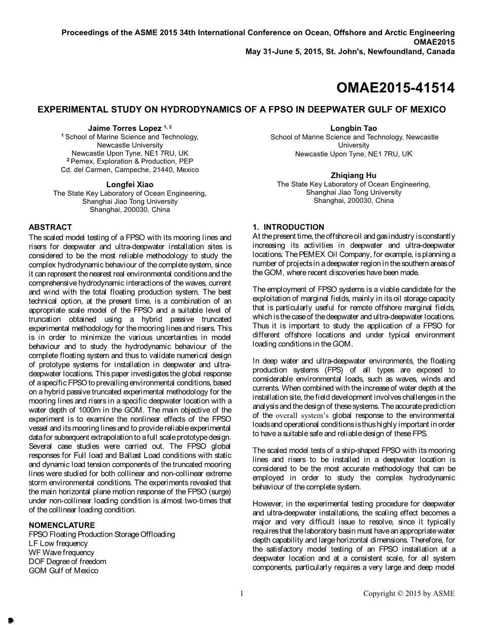 通过比例模型测试FPSO以及其系泊绳、深水立管和超深水安装网络的方法被认为是研究完整系统复杂水动力行为最为可靠的方法,它可以模拟出最为接近真实状态的环境以及整个浮式生产系统关于波浪、水流和风共同作用的综合水动力影响。目前,最好的技术选择是一套组合系统,它由一个合适的FPSO比例模型和一个适当水平的关于系泊绳和立管的混合被动截断实验方法得到的的截断组成。这是为了最大限度地减少模型的各种不确定性行为以及研究完整的浮动系统的水动力学行为,从而验证在深水和超深水地区安装的原型系统的数值设计。本文研究的关于普遍环境下的特定FPSO的全球响应,基于在墨西哥湾1000米的特定深水环境下关于系泊绳和立管的混合被动截断实验方法而得到的。实验的主要目的是研究FPSO的非线性效应及其系泊线,并为后续的原型设计提供可靠的实验数据。几个案例的研究已经开始进行。FPSO在满载和压载工况下的全球响应以及静态和动态负载下的截断系泊线的张力负荷组件的研究都是为了满足共线和非共线极状况下的极端风暴环境条件。实验结果表明:FPSO(浪涌)的主水平面运动响应在非共线加载条件下几乎是共线加载条件下的两倍。