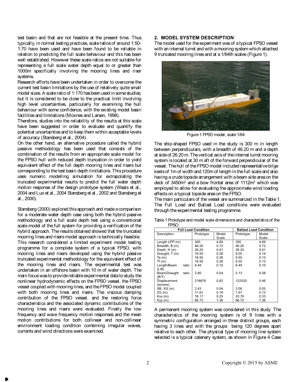 然而,在的深水和超深水地域的实验测试程序中尺缩效应成为一个主要的也是最难以解决的问题,因此它通常要求实验水池必须有合适的水深及大水。因此为了获得关于FPSO合适的深水安装位置和与之对应的比例大小的满意试验结果以及考虑到所有系统组件,需要一个非常大的和深水池模型,但是到目前为止在实际情况下这很难实现。因此,在实际的试验中通常使用1:50-1:70的尺缩比例,这对于预测实际的船体行为来说是可信的,并且这套理论已经较为成熟。但是这些比例尺度不适合于水深大于或等于1000米的海域,特别是具有系泊线和立管系统的船体。现今进行的一系列研究工作旨在克服目前使用相对比较小尺寸的模型测试水池的限制。1:70的比例尺度被广泛用于各种研究当中,但是在一些实际的限制条件下它将出现高度的不确定性,特别是在当前的水池设施和限制之下检测高精度的船体时。(Moxnes and Larsen, 1998).