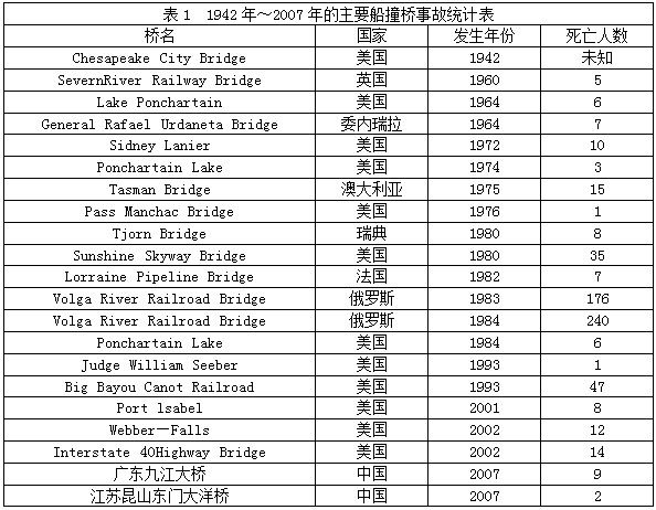 1993年美国的CSX铁路大桥,被一拖驳船队撞击,致使桥梁结构发生巨大位移,几分钟后一列游客列车从桥上经过,大桥顷刻倒塌,列车出轨,47人丧生;1983年6月,一艘轮船撞上俄罗斯伏尔加河导致桥梁坍塌,最后数百人死亡;2002年,一偏航船舶撞上美国一州公路大桥,致使桥梁坍塌导致桥梁上大量车辆掉落水里,遇难人数更是不计其数。