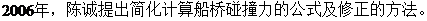 - 经验法。随着船桥碰撞理论的持续发展和人们对其研究的不断深入,各国学者结合自己的研究成果提出了很多计算船撞力的简化公式。在一些国家相关规范中,也有各自的经验公式。