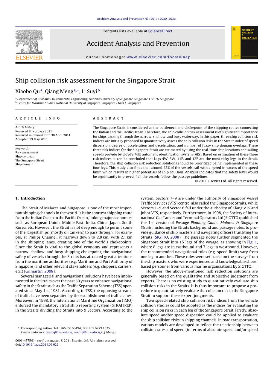 新加坡海峡船舶碰撞风险评估外文翻译资料