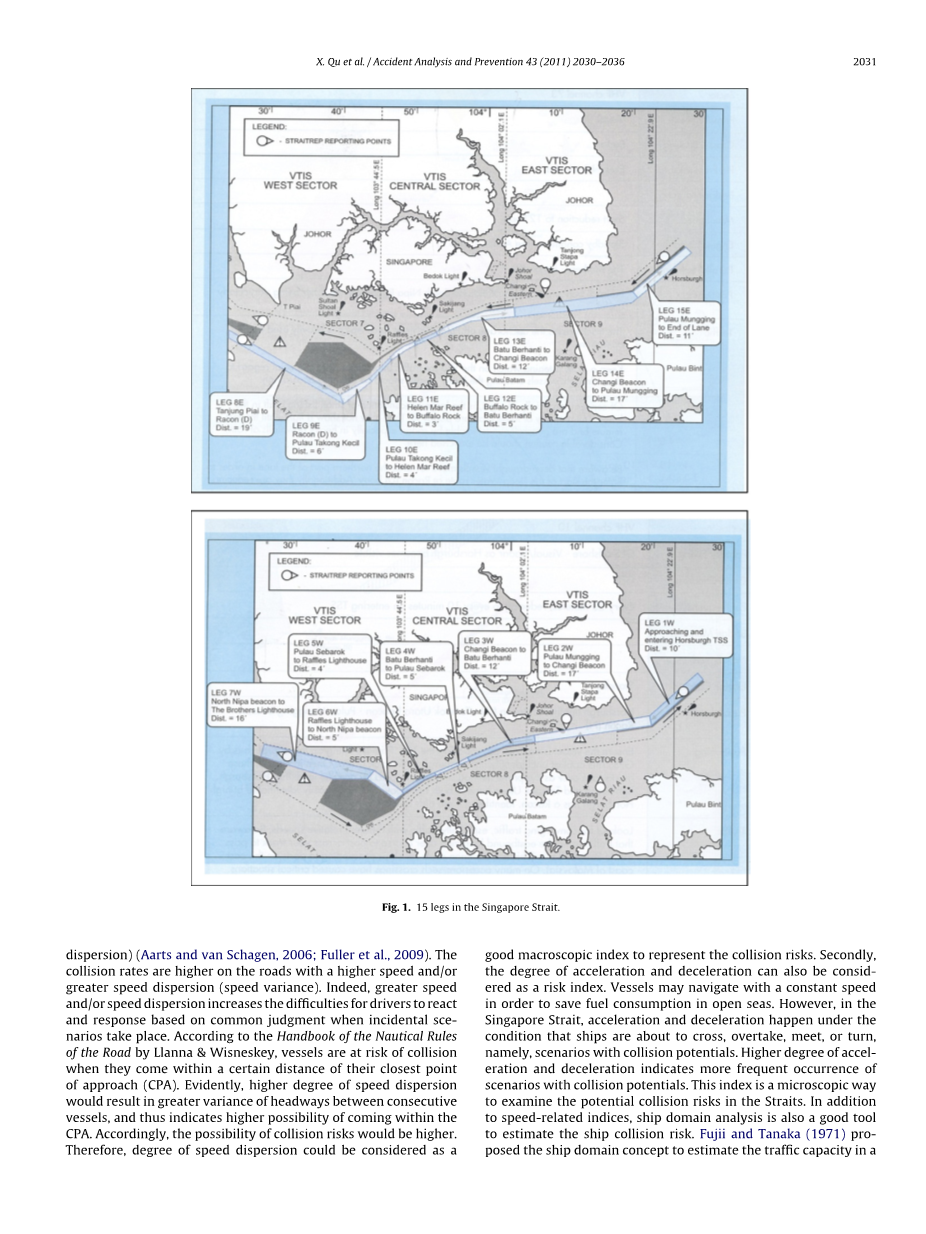 可以采用车辆碰撞研究的两个速度相关的船舶碰撞风险指数作为评估新加坡海峡两岸船舶碰撞风险的指标。首先,可以应用绝对速度和/或速度分散来评估航运中的船舶碰撞风险。在道路运输中,开发了各种模型来反映碰撞速率和速度之间的关系(以绝对速度和/或速度分散的方式)(Aarts和van Schagen,2006; Fuller et al,2009)。道路上的碰撞率在较高速度和/或更大的速度色散(速度差异)较高。事实上,更大的速度和/或速度的分散增加了驾驶员在附带情况发生时基于共同判断的反应和响应的困难。根据Llanna&Wisneskey的“道路航海规则手册”,船只在距离最近的接近点(CPA)一定距离之内时,有碰撞的危险。显然,较高程度的速度分散将导致连续血管之间的距离变化较大,从而表明在CPA内进入更高的可能性。因此,碰撞风险的可能性将更高。因此,速度分散程度可以被认为是一个良好的宏观指标来代表碰撞风险。 其次,加速度和减速度也可以被认为是风险指数。船舶可以以恒定的速度导航,以节省公海的燃料消耗。 但是,在新加坡海峡,加速和减速发生在船只即将越过,超车,遇见或转弯的条件下,即具有碰撞潜力的场景。更高的加速度和减速度表明更频繁地发生具有碰撞潜力的场景。 该指标是微观检验海峡潜在碰撞风险的方法。除了速度相关指标外,船舶领域分析也是估算船舶碰撞风险的好工具。富士和田中(1971)提出了船舶领域概念来估算航运水路的交通能力。四年后,古德温(1975年)将船舶域定义为“船舶导航员要保留其他船舶或固定物体的周围有效水域”。从那时起,船舶领域已被应用于估计船舶的频率碰撞(Pietrzykowski,2008; Pietrzykowski和Uriasz,2009; Szlapczynski,2006; Wang,2010)。因此,海峡的船舶碰撞风险也可以使用船舶分析来评估。