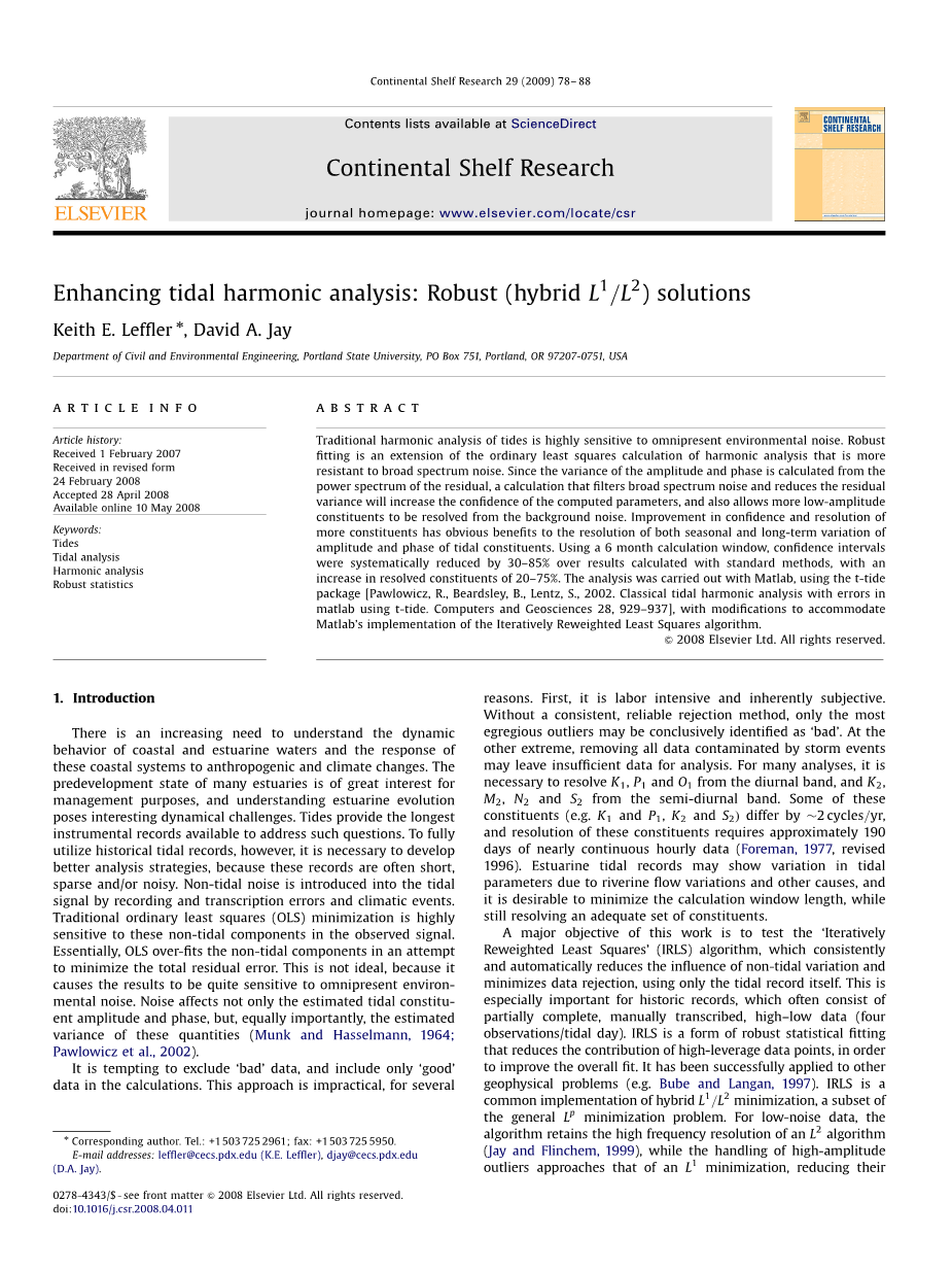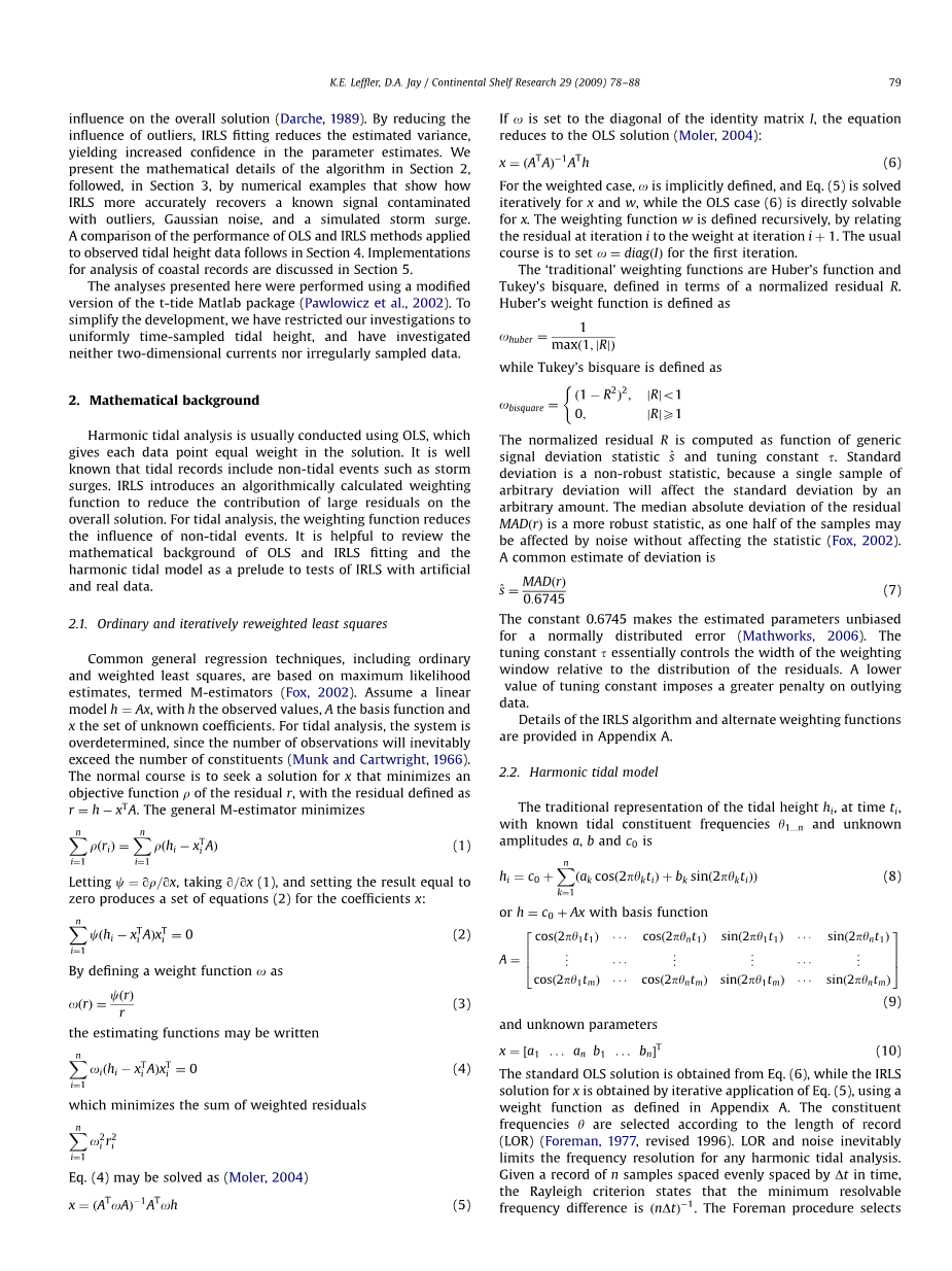这项工作的一个主要目标是测试“迭代重加权最小二乘法”(IRLS)算法,该算法仅使用潮汐记录本身,一致地减少非潮汐变化的影响并做最小化数据拒绝。这对于历史记录尤其重要,历史记录通常包括部分完整的,手动转录的高低数据(四个观察/潮汐日)。IRLS是一种强大的统计拟合形式,可以减少高杠杆数据点的贡献,从而提高整体拟合度。它已成功应用于其他地球物理问题(例如Bube和Langan,1997)。IRLS是混合L1 = L2最小化的常见实现,是一般Lp最小化问题的子集。对于低噪声数据,该算法保留了L2算法的高频分辨率(Jay和Flinchem,1999),而高幅度异常值的处理接近L1最小化的处理,降低了它们对整体解决方案的影响(Darche, 1989)。通过减少异常值的影响,IRLS拟合减少了估计的方差,从而增加了参数估计的置信度。我们在第2节中介绍算法的数学细节,然后在第3节中,通过数值例子说明IRLS如何更准确地恢复被异常值,高斯噪声和模拟风暴潮污染的已知信号。应用于观测到的潮汐高度数据的OLS和IRLS方法的性能比较见第4节。沿海记录分析的实施在第5节中讨论。