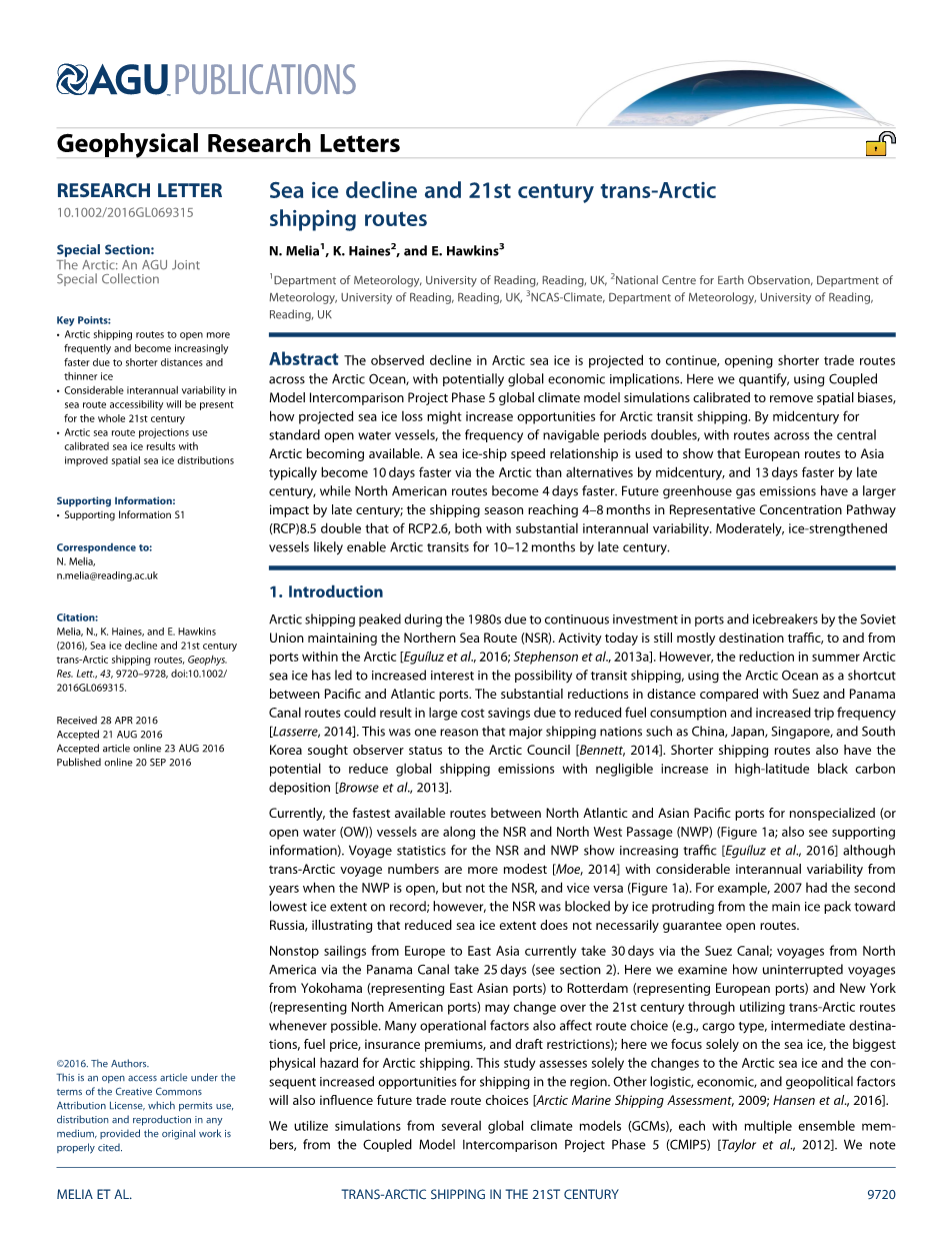 目前对于普通船只来说,在北大西洋和亚洲太平洋港口之间(或开放水域(OW))用时最短的可行航道是NSR和西北航道(NWP)(图1a;另请见参考信息)。NSR和NWP的航次的统计数据显示[Eguiacute;luz 等人, 2016],当NWP(而不是NSR)开放的时候(图1a),尽管跨北极航次数量比年际变化来得小(MOE,2014年),但是航次数量依旧在增加,反之亦然(图1a)。例如,2007年是冰情记录中次良好的年份;然而,NSR航线被从主冰层向俄罗斯延伸出的冰阻挡,说明了冰情的缓和不一定保证开放航线的可通行性。