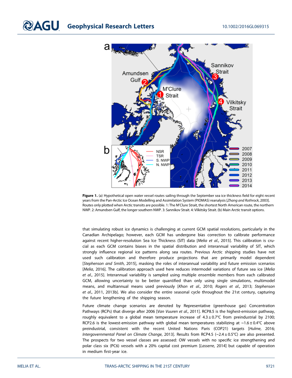我们利用了来自多个全球气候模型(GCMs)的模拟。其中,每个模型都有多个集合成员,且它们均来自“耦合模型对比项目第5阶段” 这一研究计划(CMIP5) [Taylor 等人, 2012]。我们注意到,在当前的GCM空间分辨率下模拟强冰运动是十分困难的,尤其是在加拿大群岛附近;但是,与最近的一项更高分辨率的海冰厚度(SIT)数据校准性能相比,每个GCM都经过了偏差校正[Melia等人, 2015]。由于每个GCM在SIT的空间分布和年际变化中都存在偏差,航线上的区域冰模式受到了较大影响——因此GCM的校准偏差是极其重要的。先前的北极航运研究并未使用这种校准,所以海冰的研究主要依赖于最初始的模型[Stephenson and Smith, 2015],导致它忽略了年际变化和航行预期排放[Melia, 2016]。这里使用的校准方法减少了未来的海冰模型之间的差异[Melia等人., 2015]。比起以前仅使用单一模拟、多模平均值和多年度平均值,使用来自每个校准的GCM的多个集合成员对年际变化进行采样,不确定性得到了更好的量化[Khon等人, 2010; Rogers等人, 2013; Stephenson等人, 2011, 2013b]。我们还考虑到整个21世纪的整体季节周期,预见到未来的航运季节将会延长。