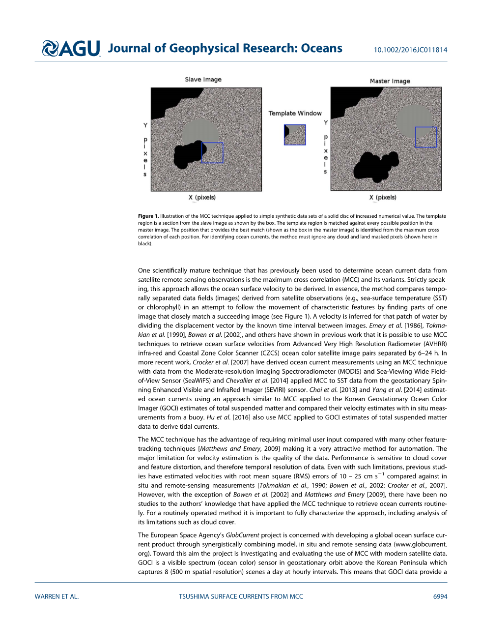 欧洲空间局的全球海流项目致力于通过模型、现场观测和遥感数据的协同结合开发全球海洋表面海流产品(www.globcurrent.org)。为此,该项目正在调查和评估现代卫星数据对MCC的使用情况。GOCI是朝鲜半岛上空地球静止轨道上的可见光谱(海洋颜色)传感器。它每隔一小时捕捉8(500m空间分辨率)场景。这意味着GOCI数据提供了一个数据的高时间分辨率,对MCC技术进行了全新的评估,而大多数以前的应用和评估都受到缓慢重复时间的限制。在连续的卫星观测中,拟议的未来地球静止飞行任务,如海洋颜色高级永久成像仪[IOCCG,2012],提供地面采样的每小时图像在250米的分辨率下,使用MCC测量海面洋流可能变得越来越有用。